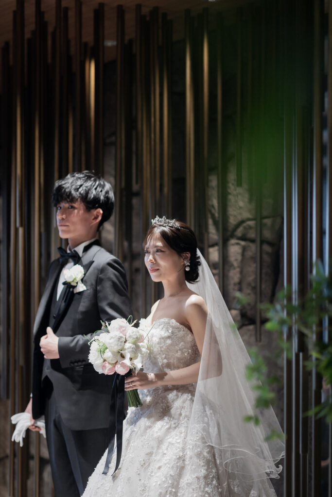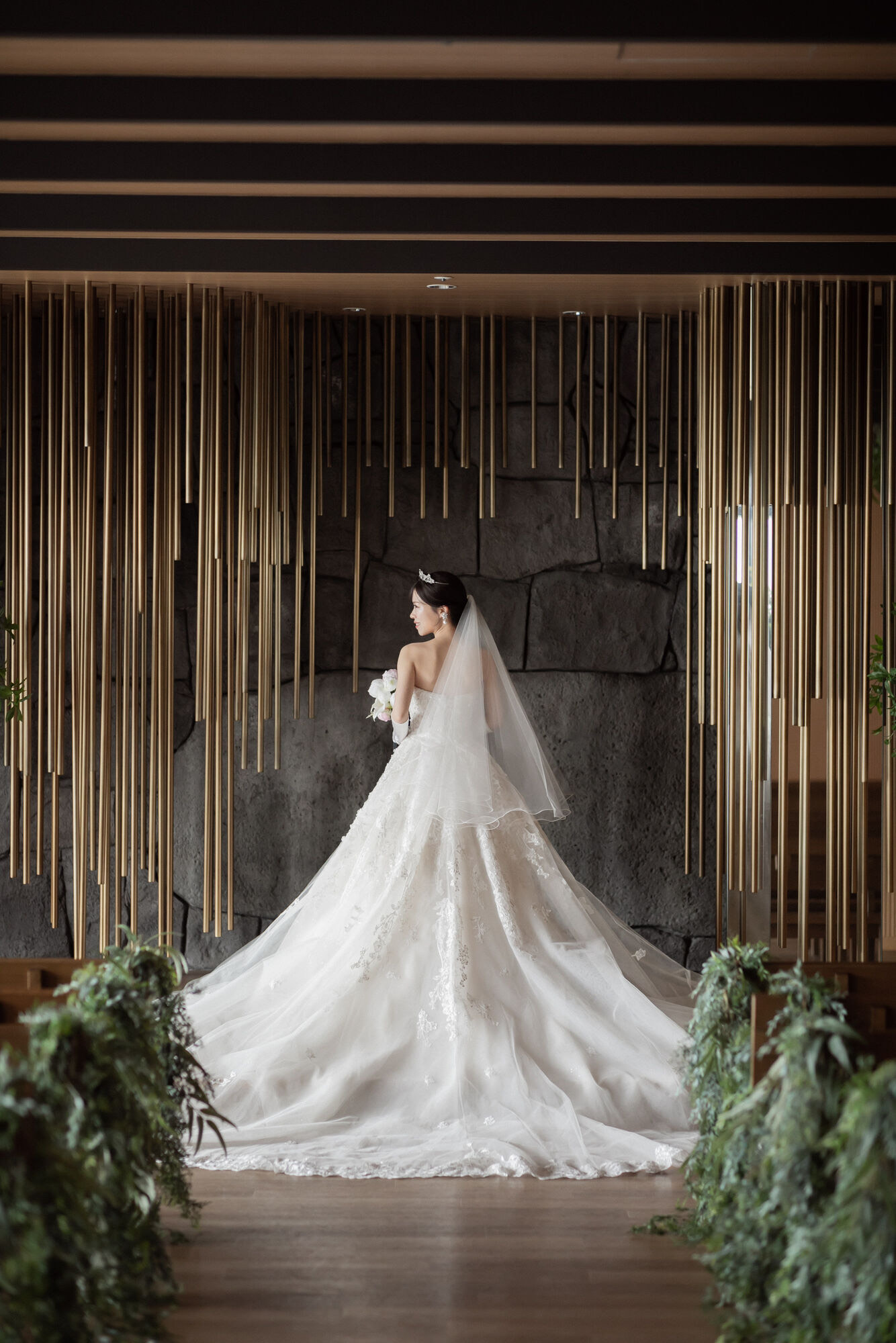挙式ではトレーンを、ご披露宴ではお袖をプラスされ
