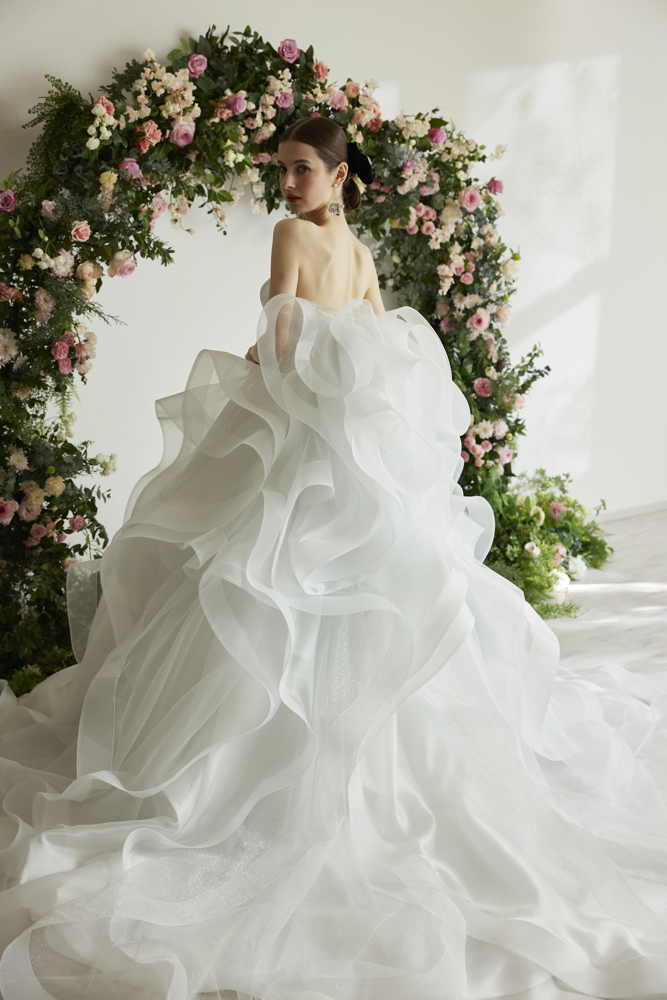 流動感あるバックスタイルとドレープシルエット、