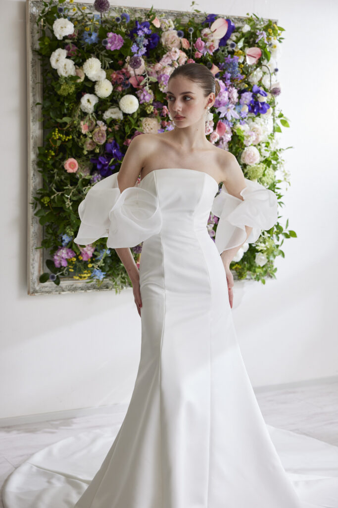 サテンの優雅で上品な輝きに包まれた、エレガントで女性美溢れるマーメイドドレス。
