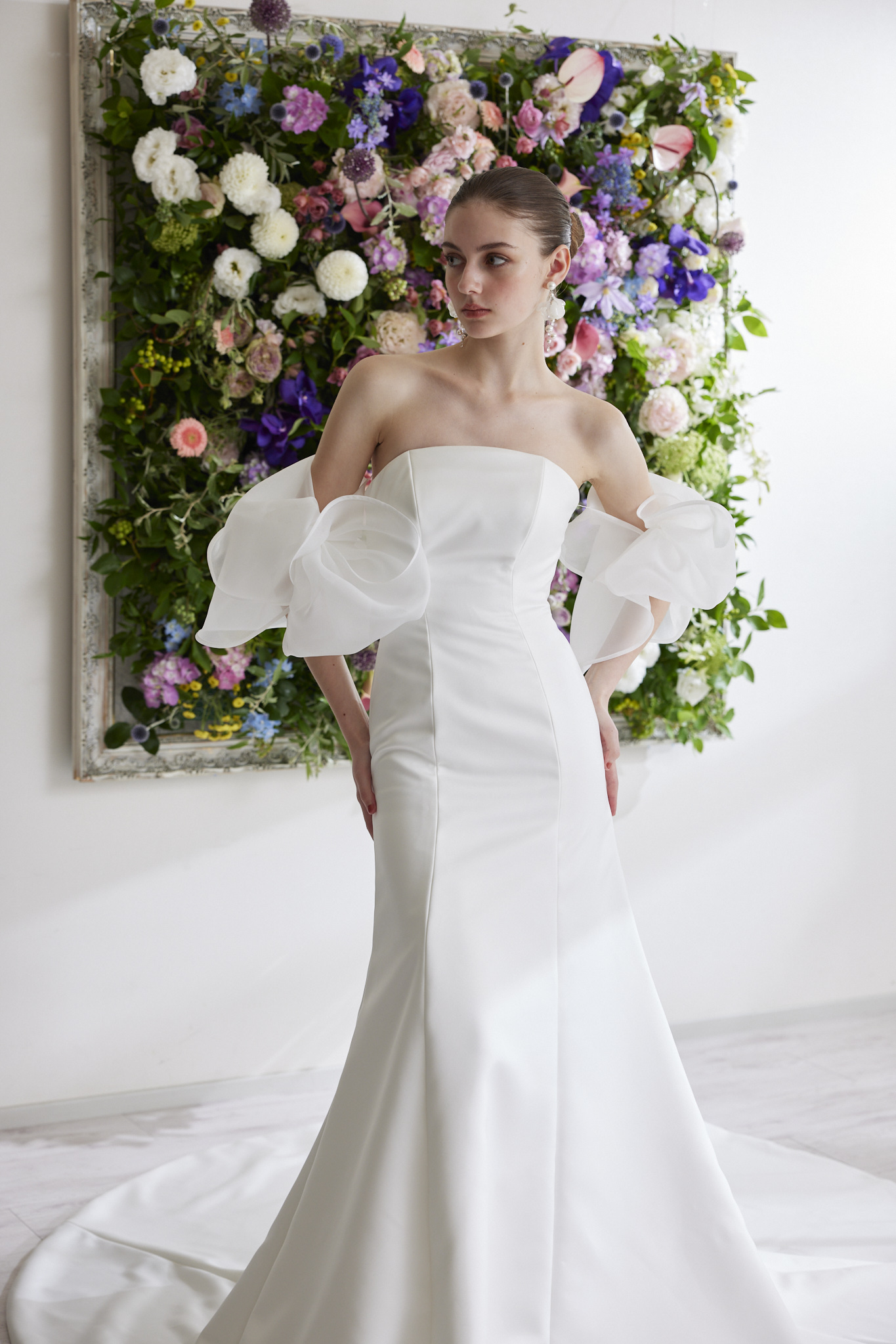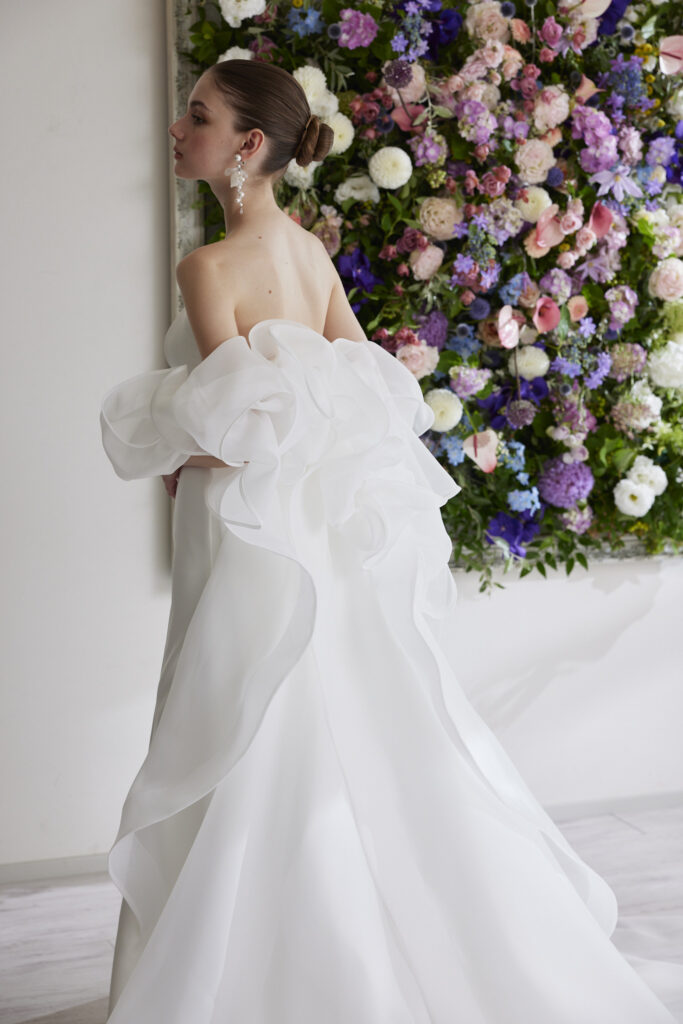 取り外しができる曲線美が綺麗なバックトレーンは、軽やかな数種類のサテンオーガンジーを重ね、