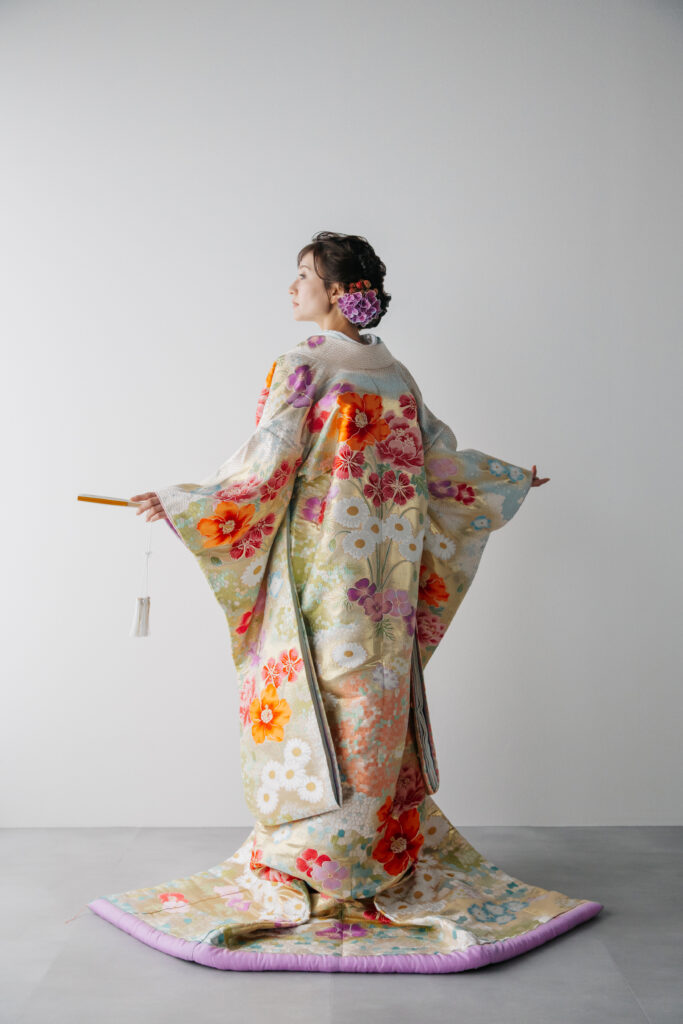 柔らかな淡色の地に、花々が咲き誇る上品さと華やかさが調和した色打掛