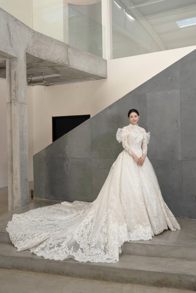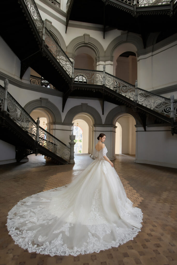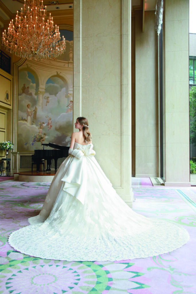 ロングトレーンの存在感や、レースや装飾の美しさを