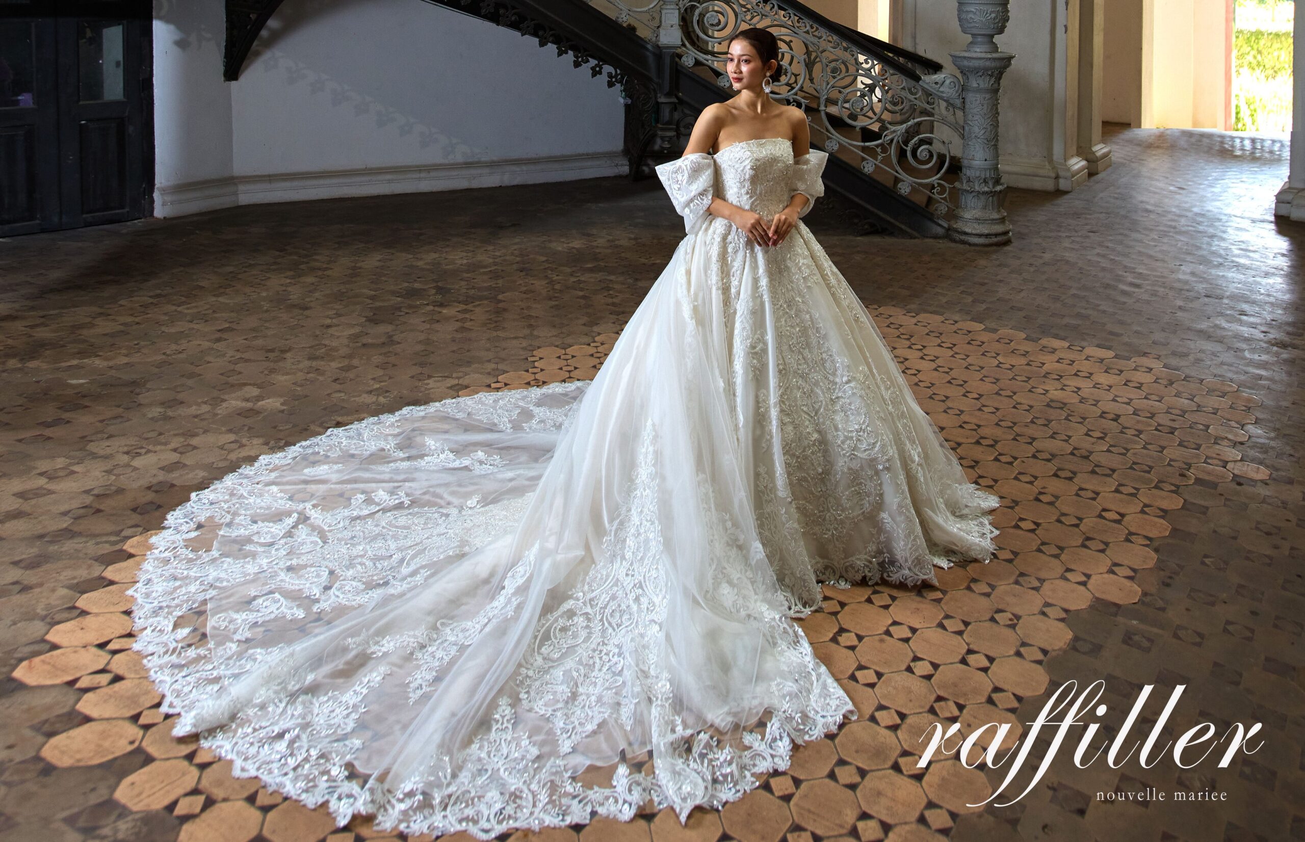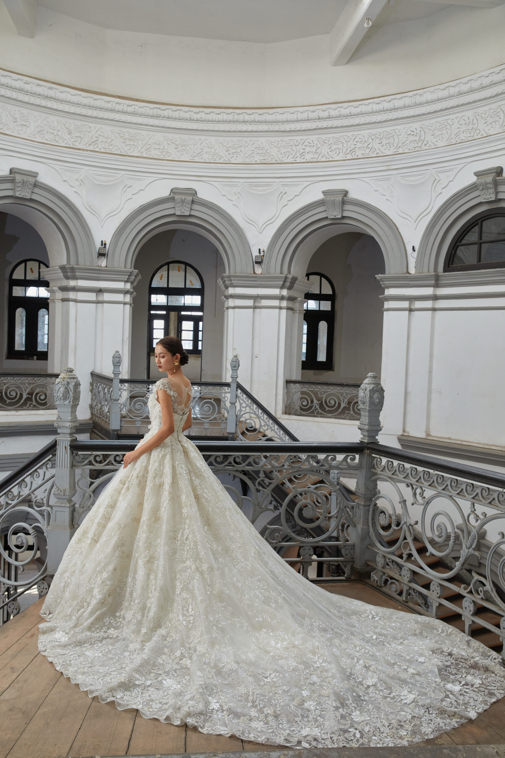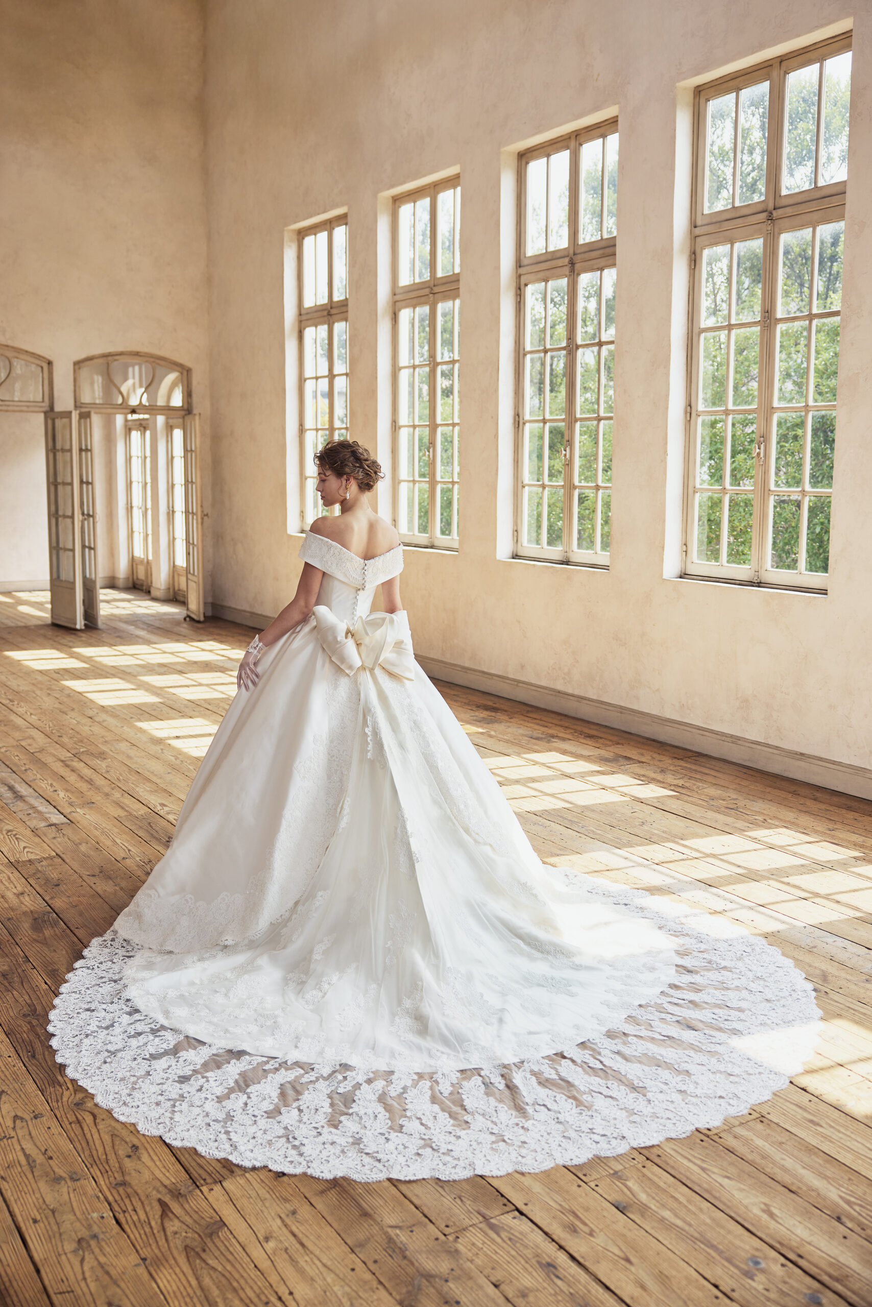 ロングトレーンの存在感や、レースや装飾の美しさを