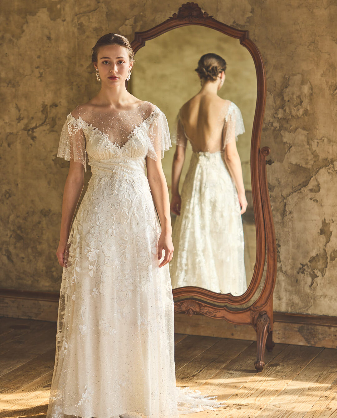 トップには立体感のあるレースにビジューがあしらわれ上品な雰囲気。華やかなボリュームラインは透け感のある愛らしいニュアンスカラー。ブラウスをオフしビスチェドレスとしても着られる2wayドレス