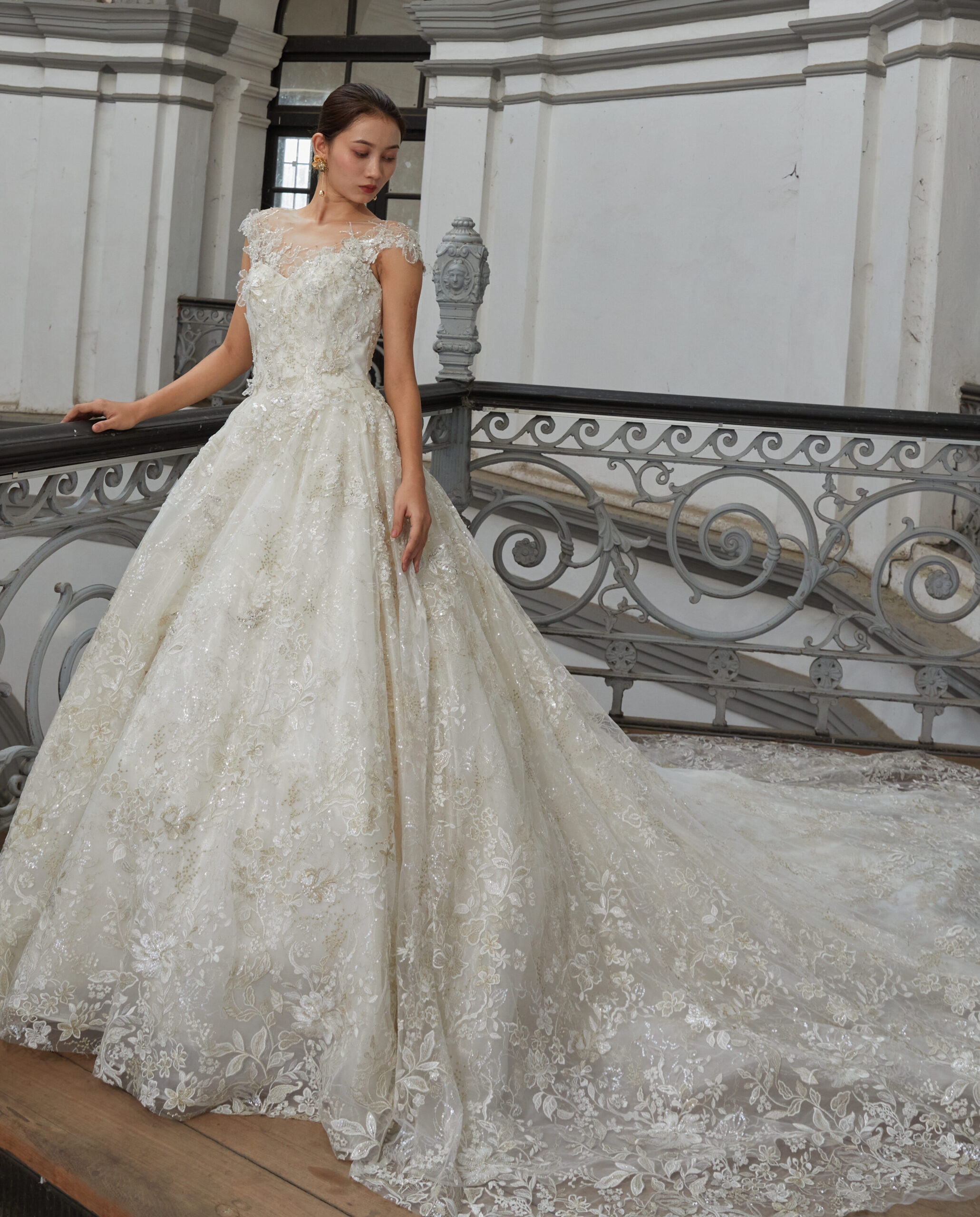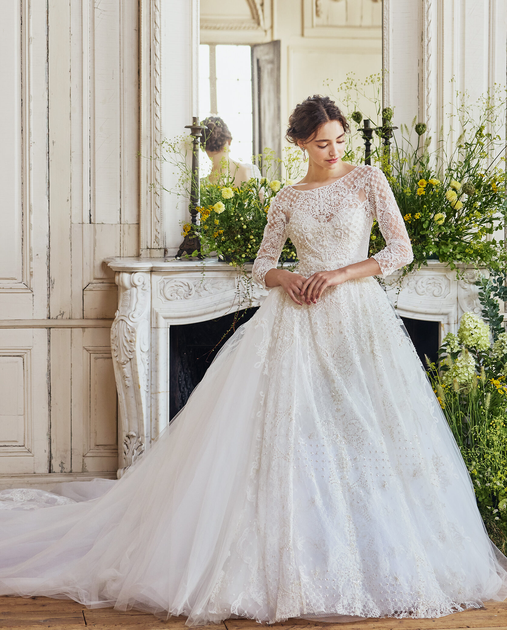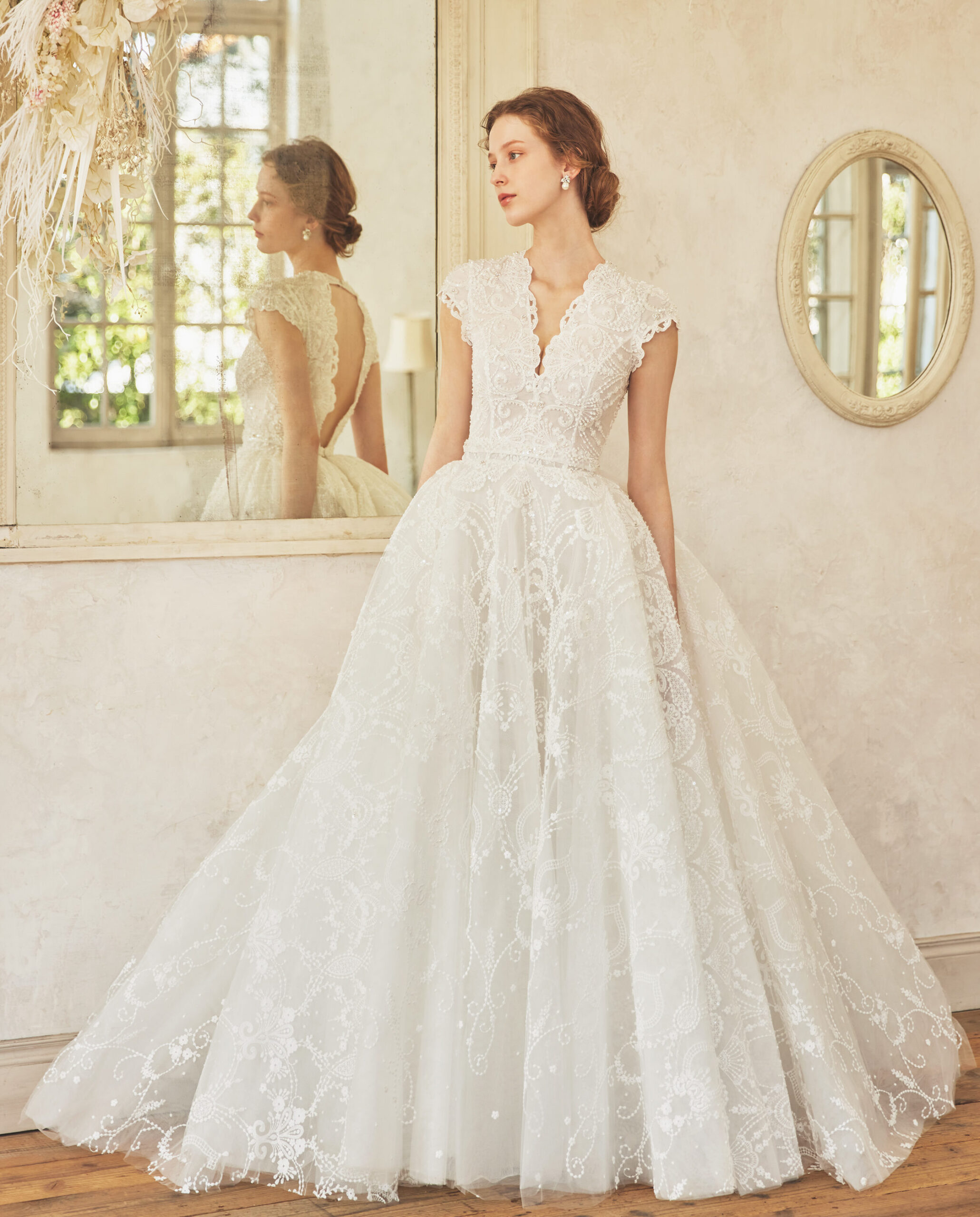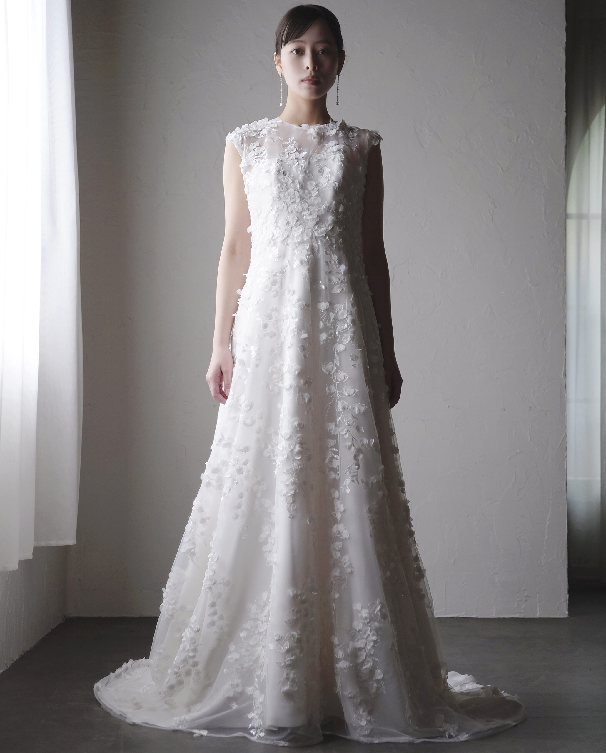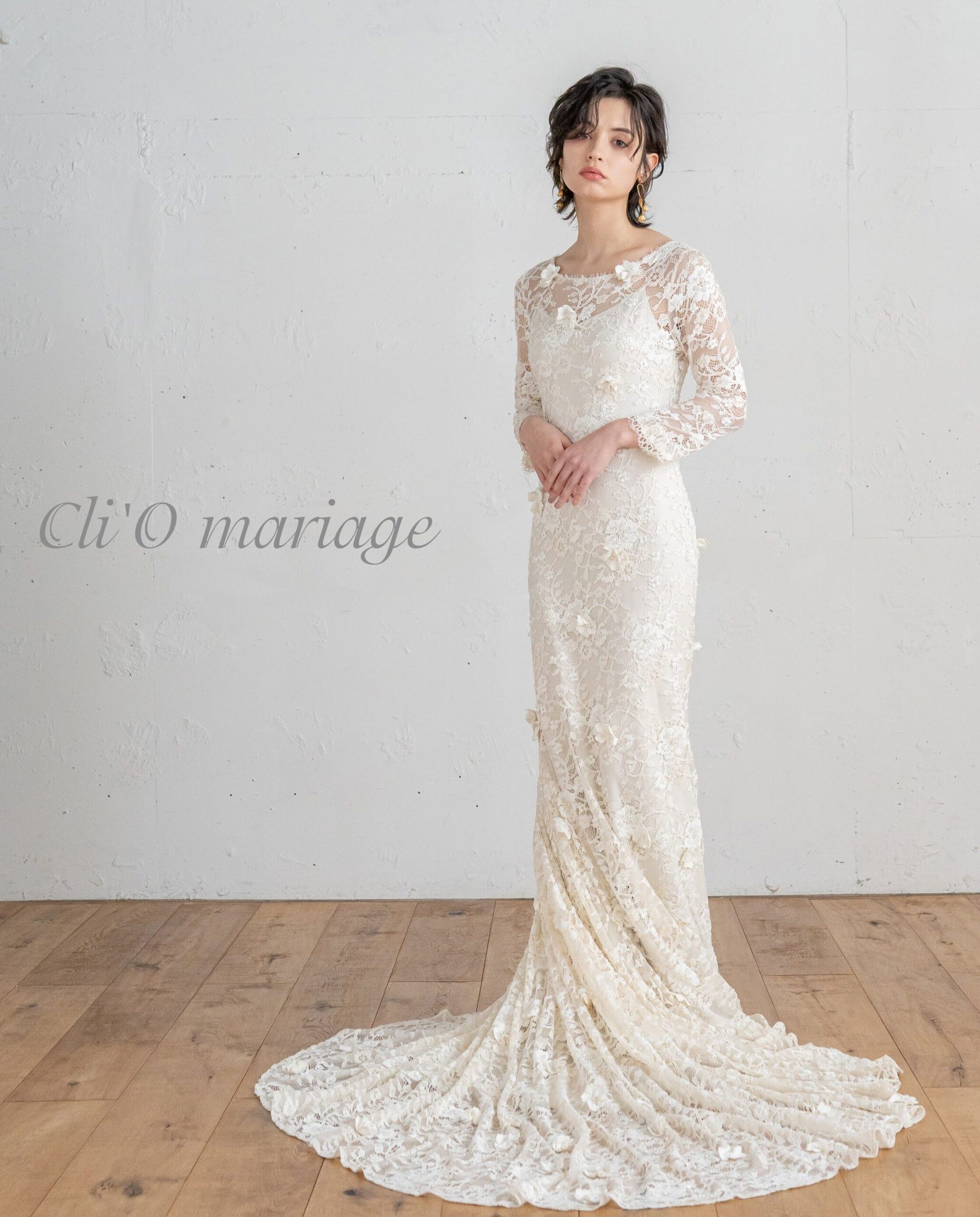 大柄の印象的なレースにビージングが施され、鎖骨がのぞくネックラインが上品な印象を与えてくれる。 ノースリーブですっきりと仕上げられ、美しい曲線を描くフィットアンドフレアのシルエット。 トランスペアレントなレースがバックスタイルを優美にしてくれる。