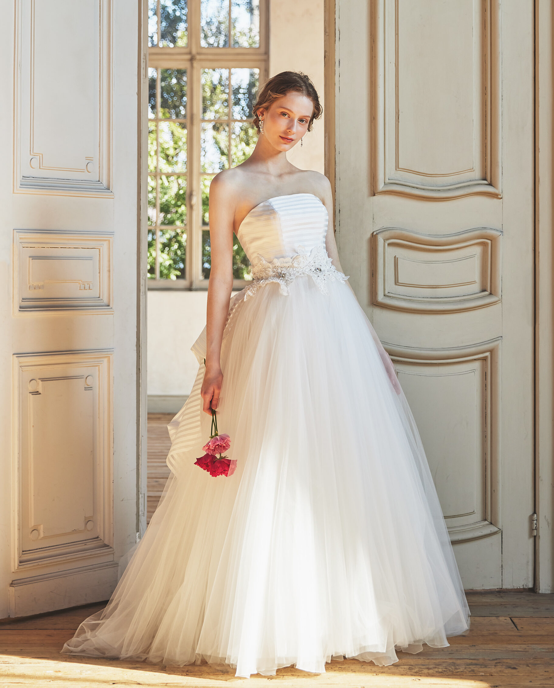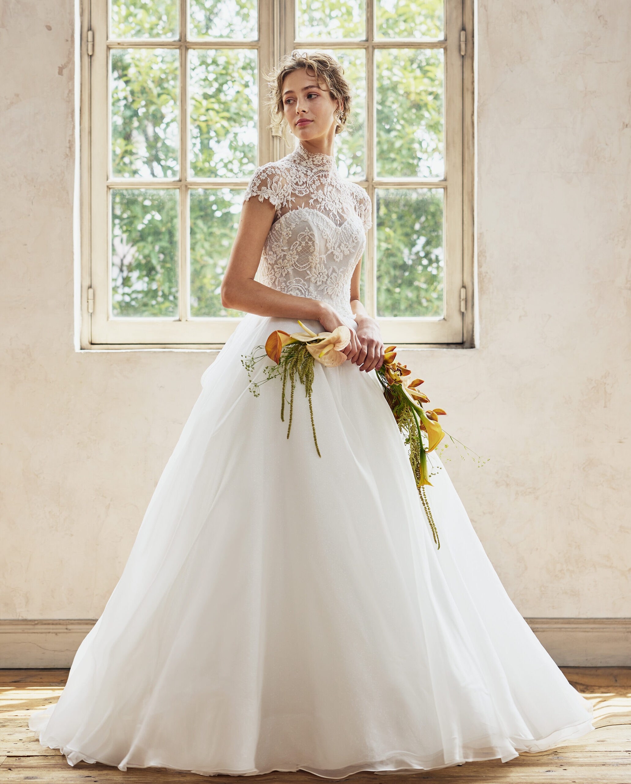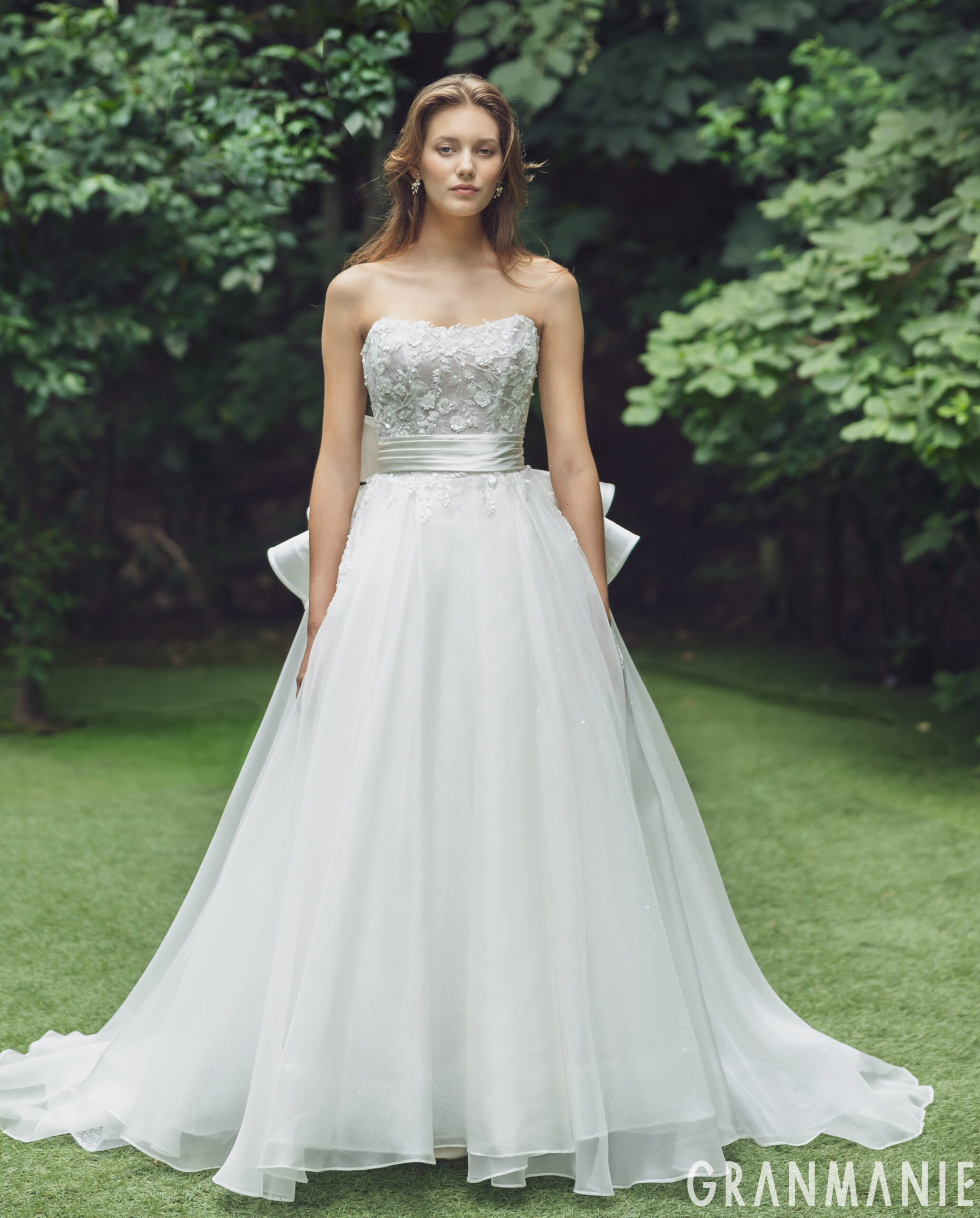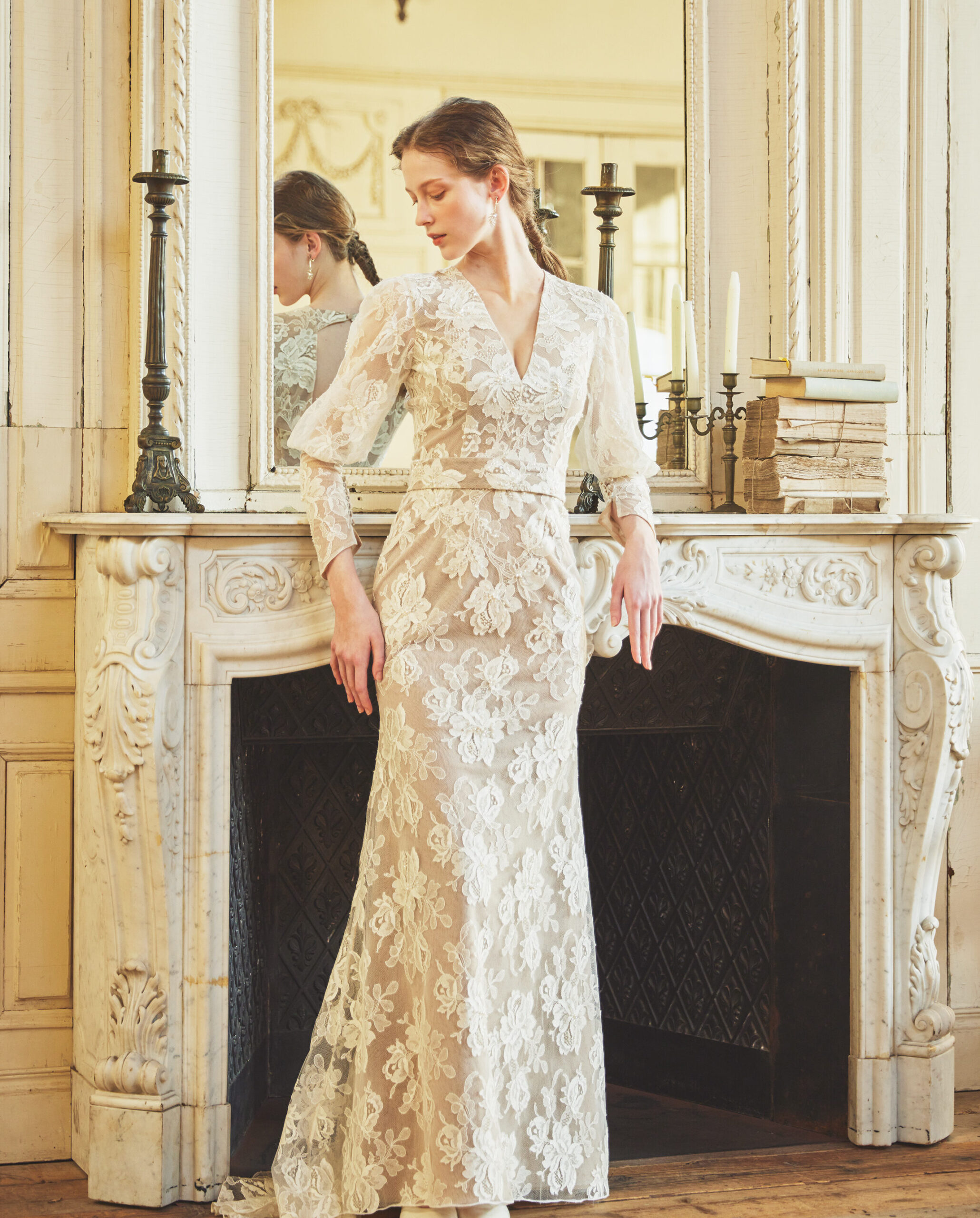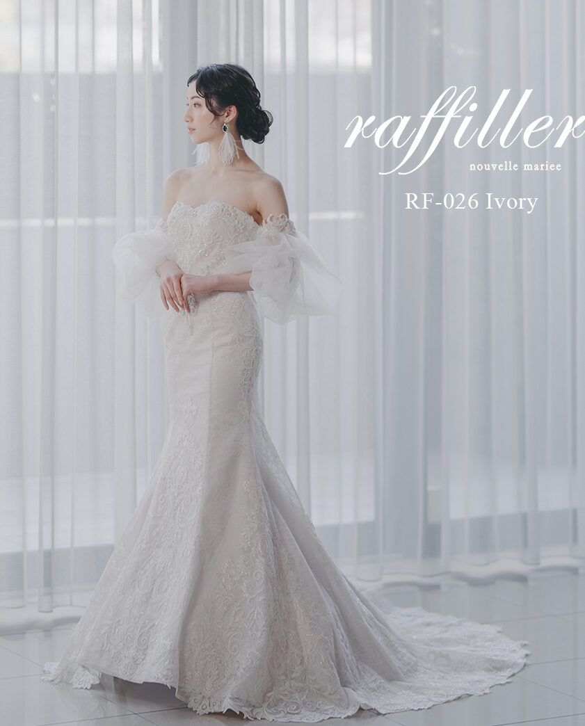 大柄の印象的なレースにビージングが施され、鎖骨がのぞくネックラインが上品な印象を与えてくれる。 ノースリーブですっきりと仕上げられ、美しい曲線を描くフィットアンドフレアのシルエット。 トランスペアレントなレースがバックスタイルを優美にしてくれる。