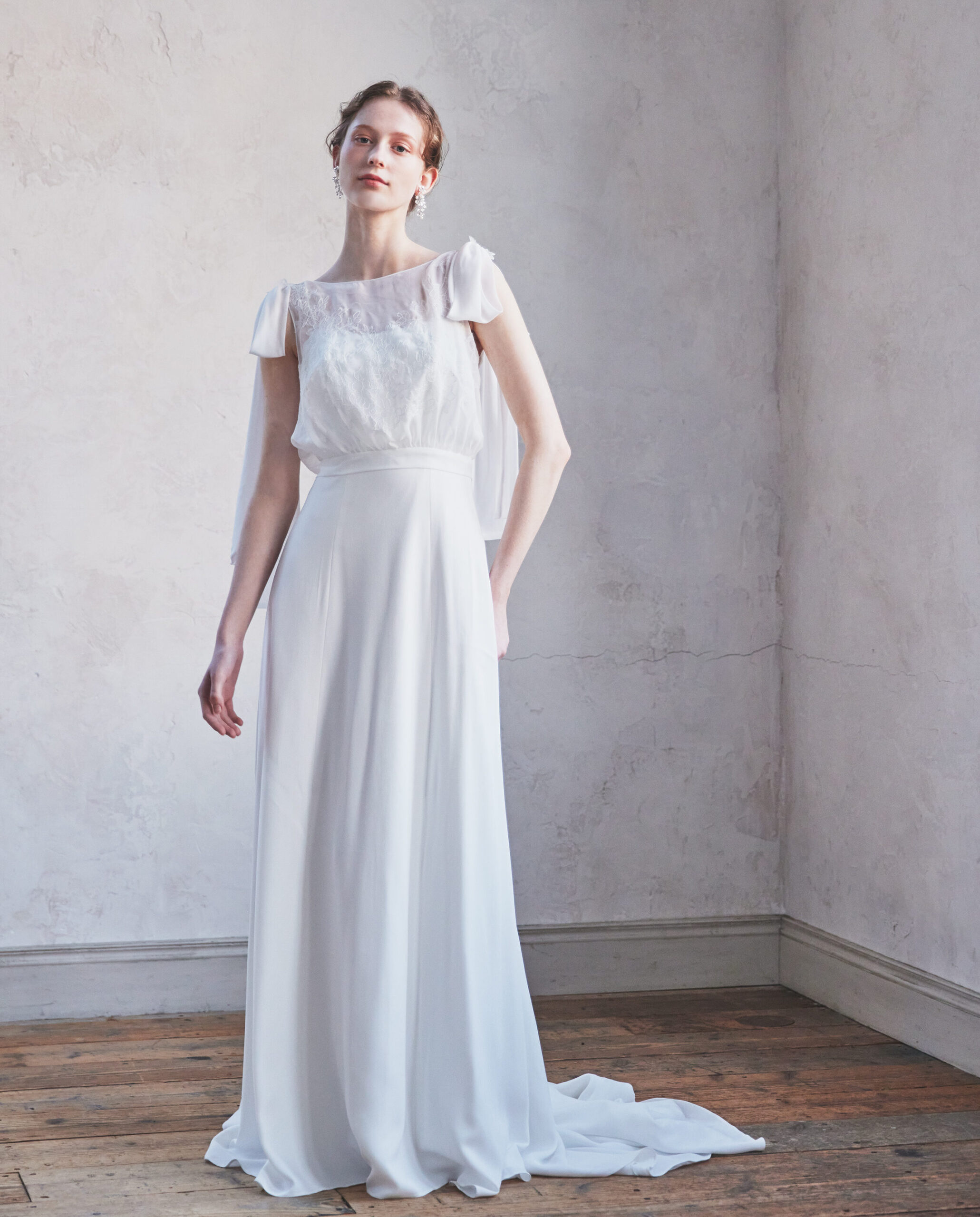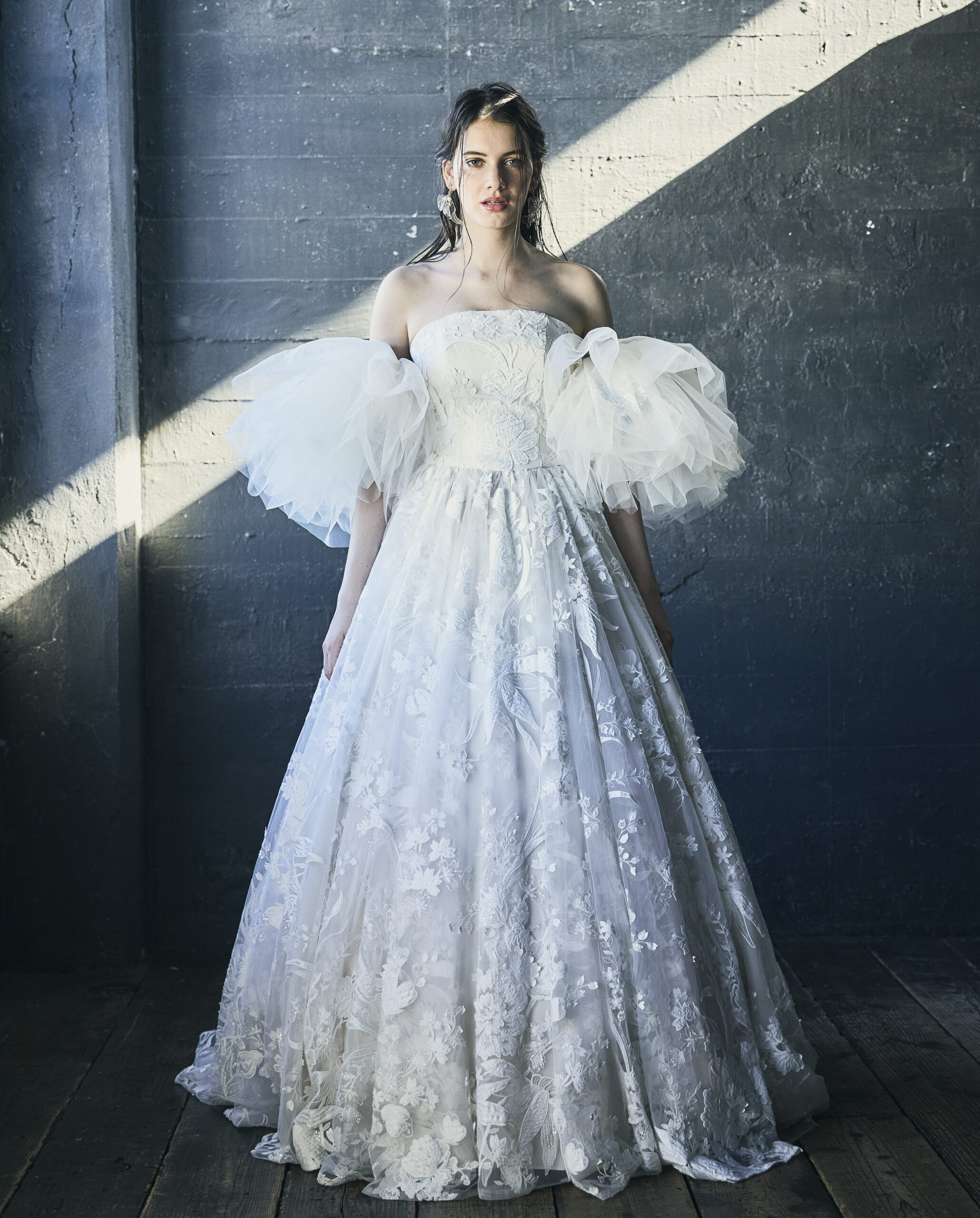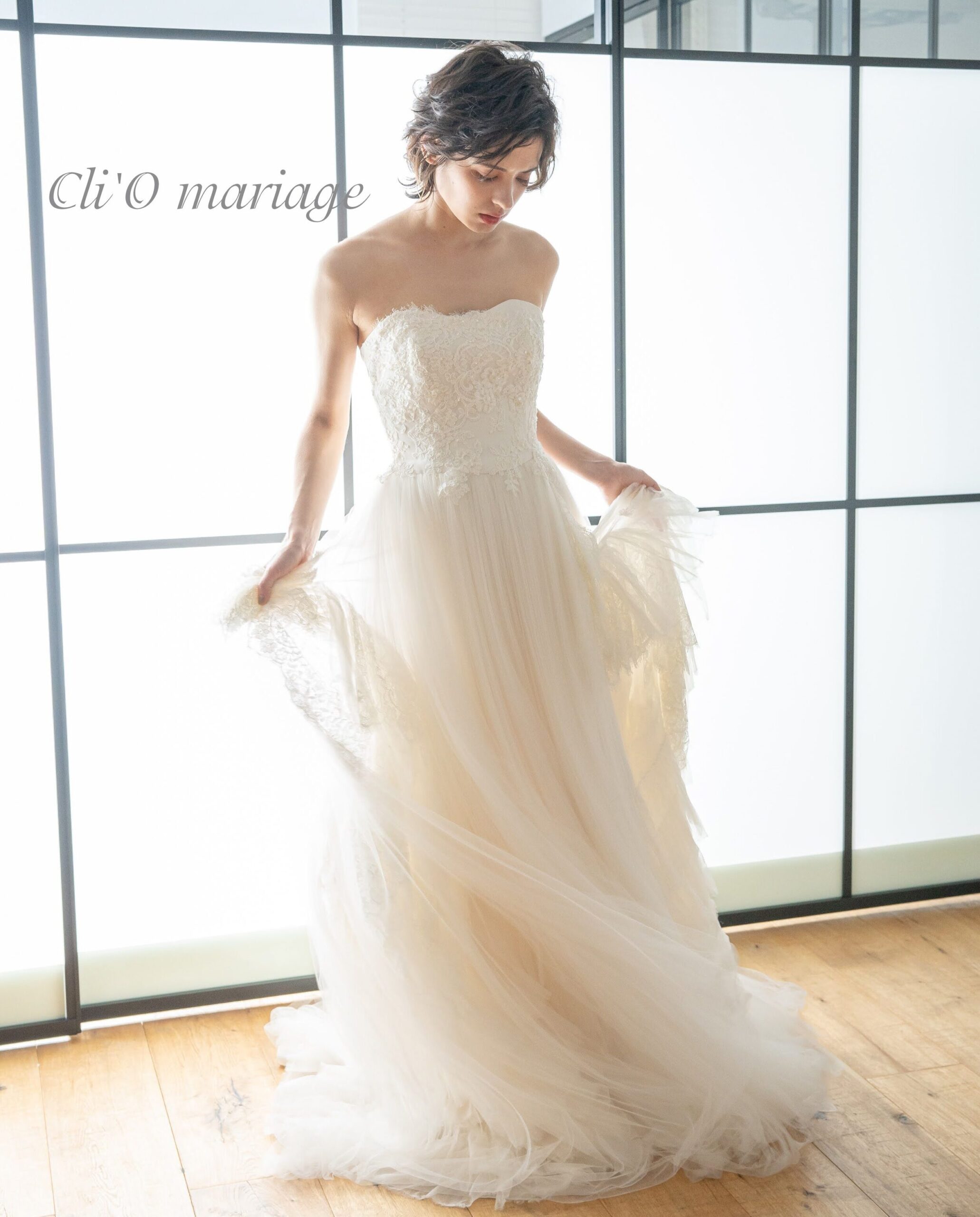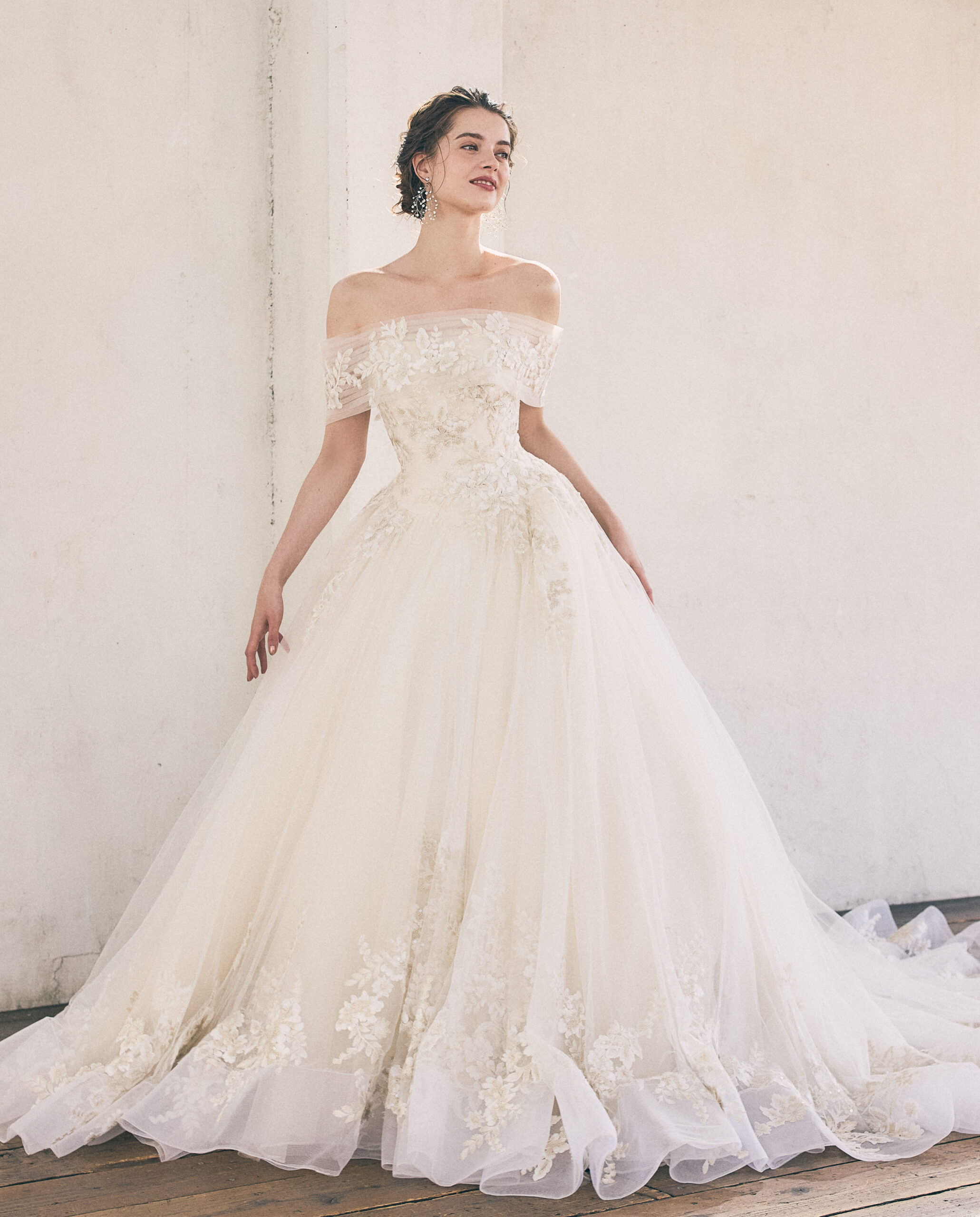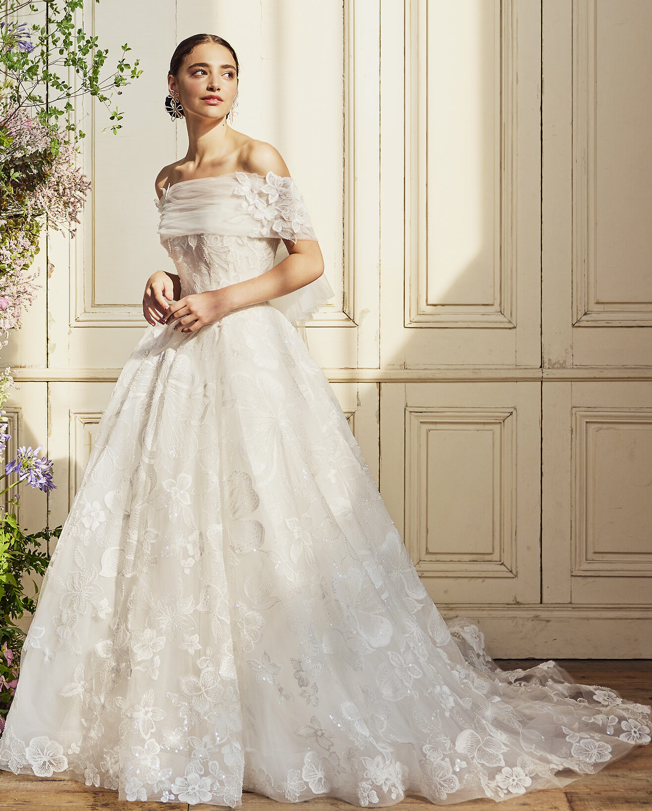 大柄の印象的なレースにビージングが施され、鎖骨がのぞくネックラインが上品な印象を与えてくれる。 ノースリーブですっきりと仕上げられ、美しい曲線を描くフィットアンドフレアのシルエット。 トランスペアレントなレースがバックスタイルを優美にしてくれる。