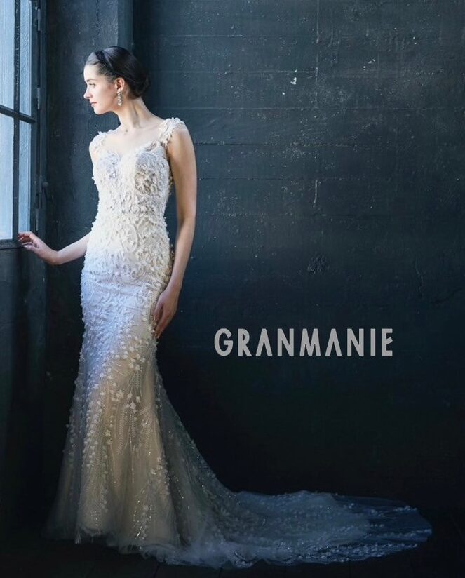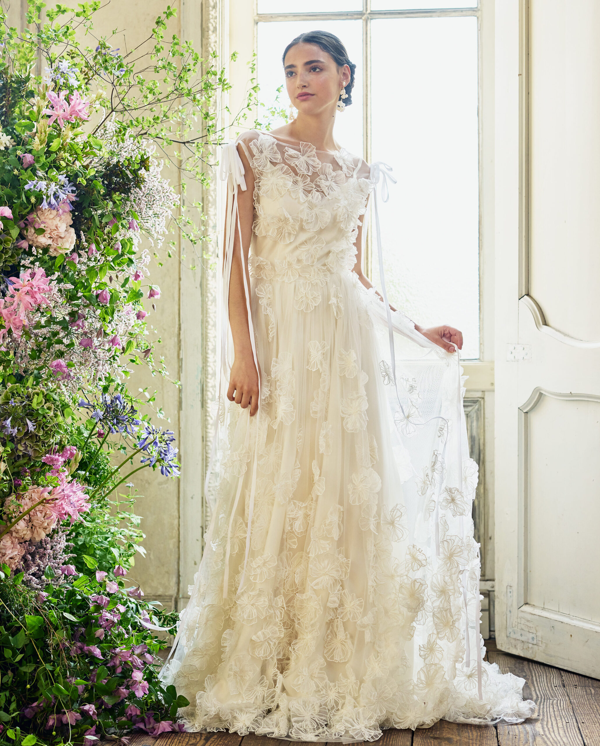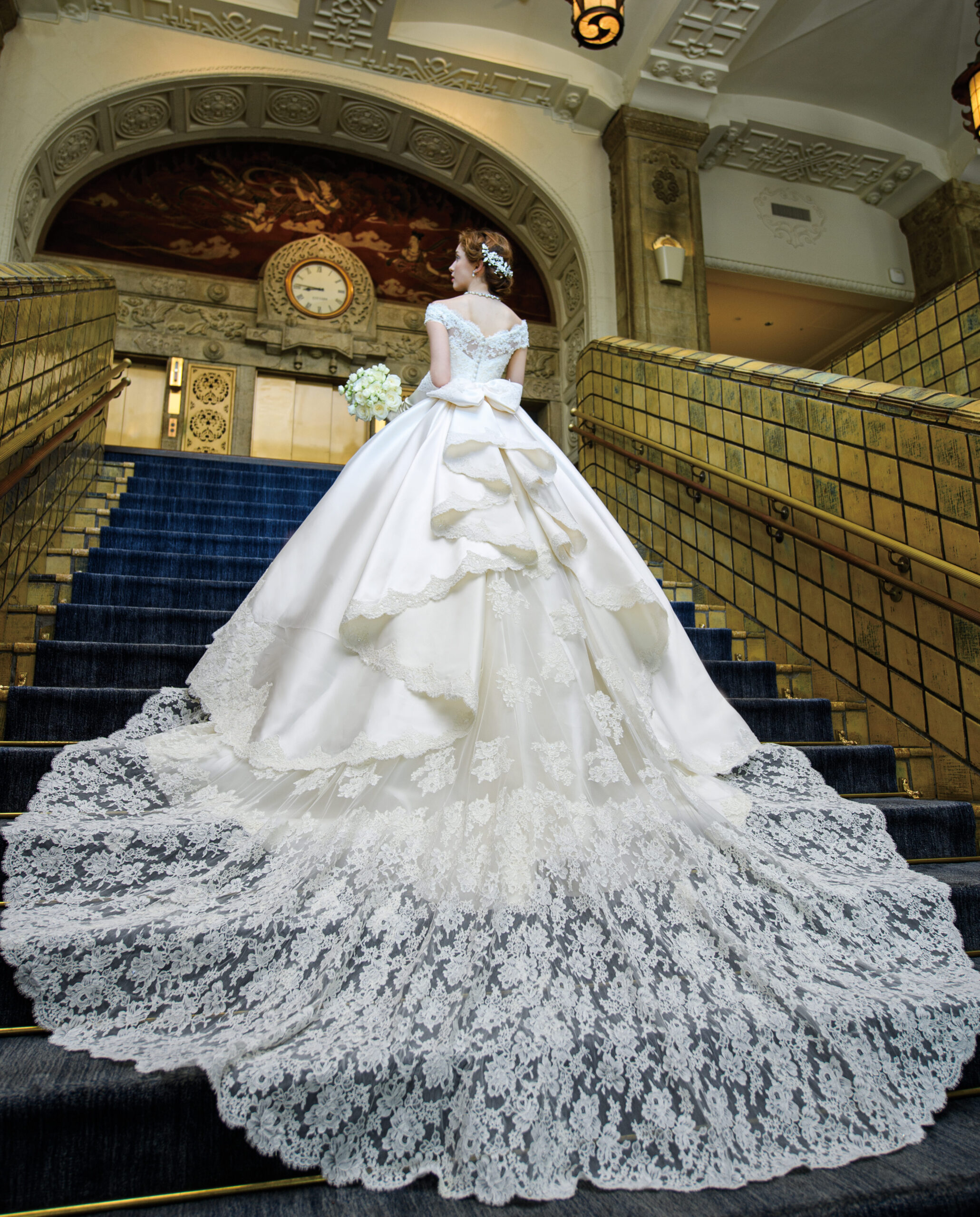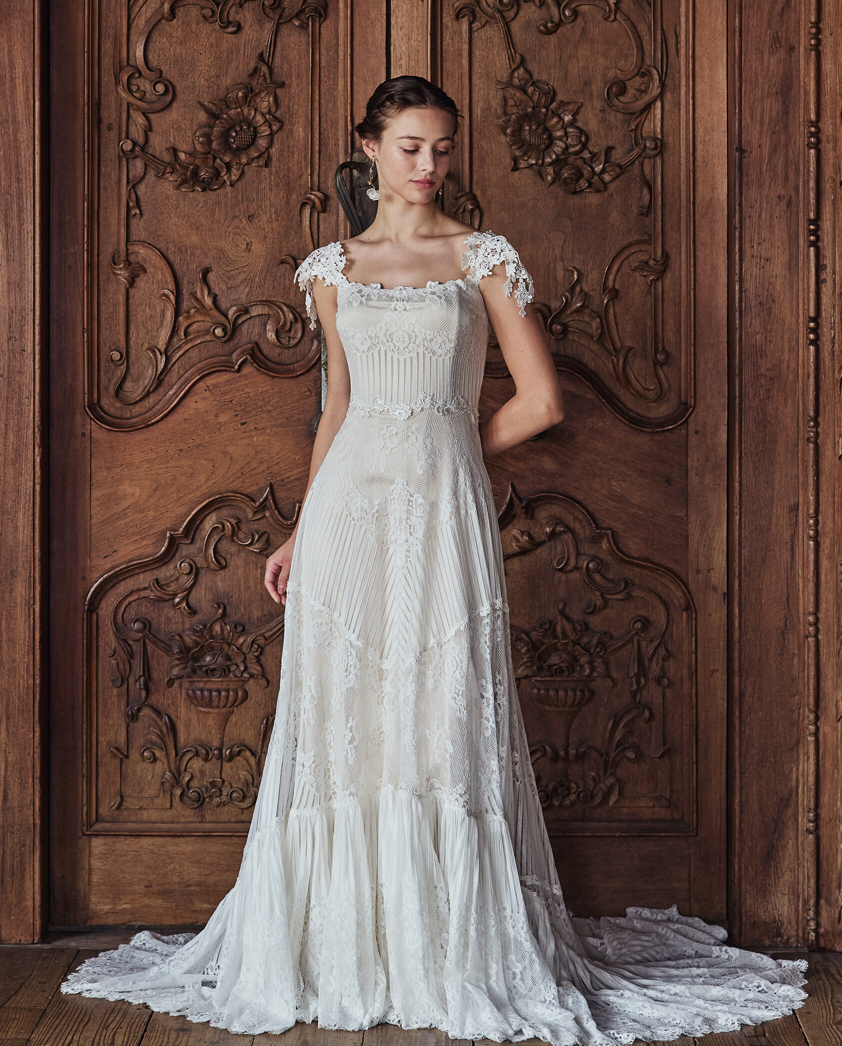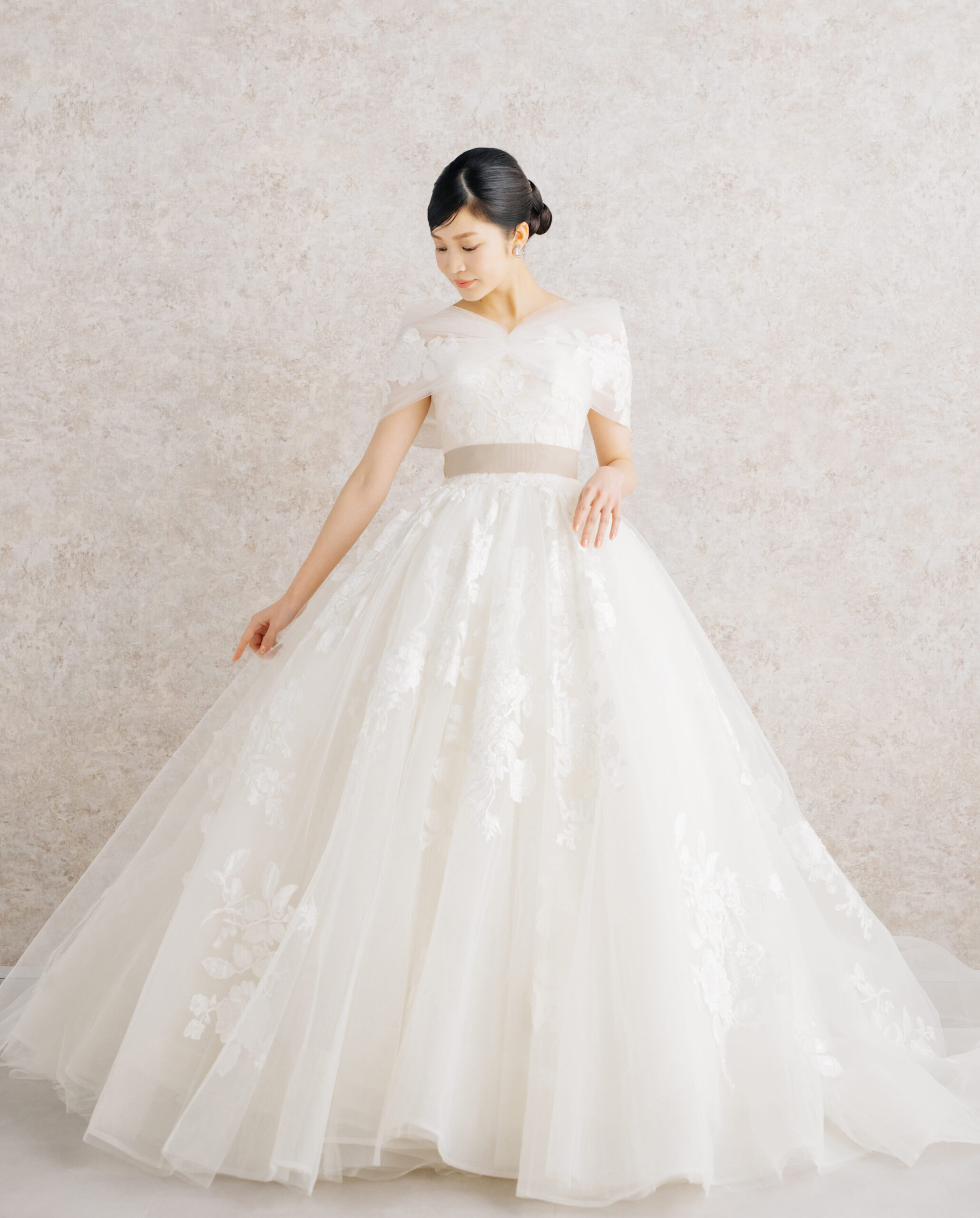大柄の印象的なレースにビージングが施され、鎖骨がのぞくネックラインが上品な印象を与えてくれる。 ノースリーブですっきりと仕上げられ、美しい曲線を描くフィットアンドフレアのシルエット。 トランスペアレントなレースがバックスタイルを優美にしてくれる。