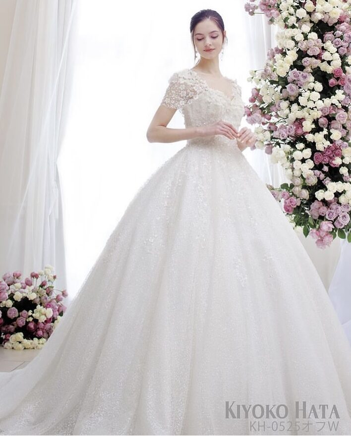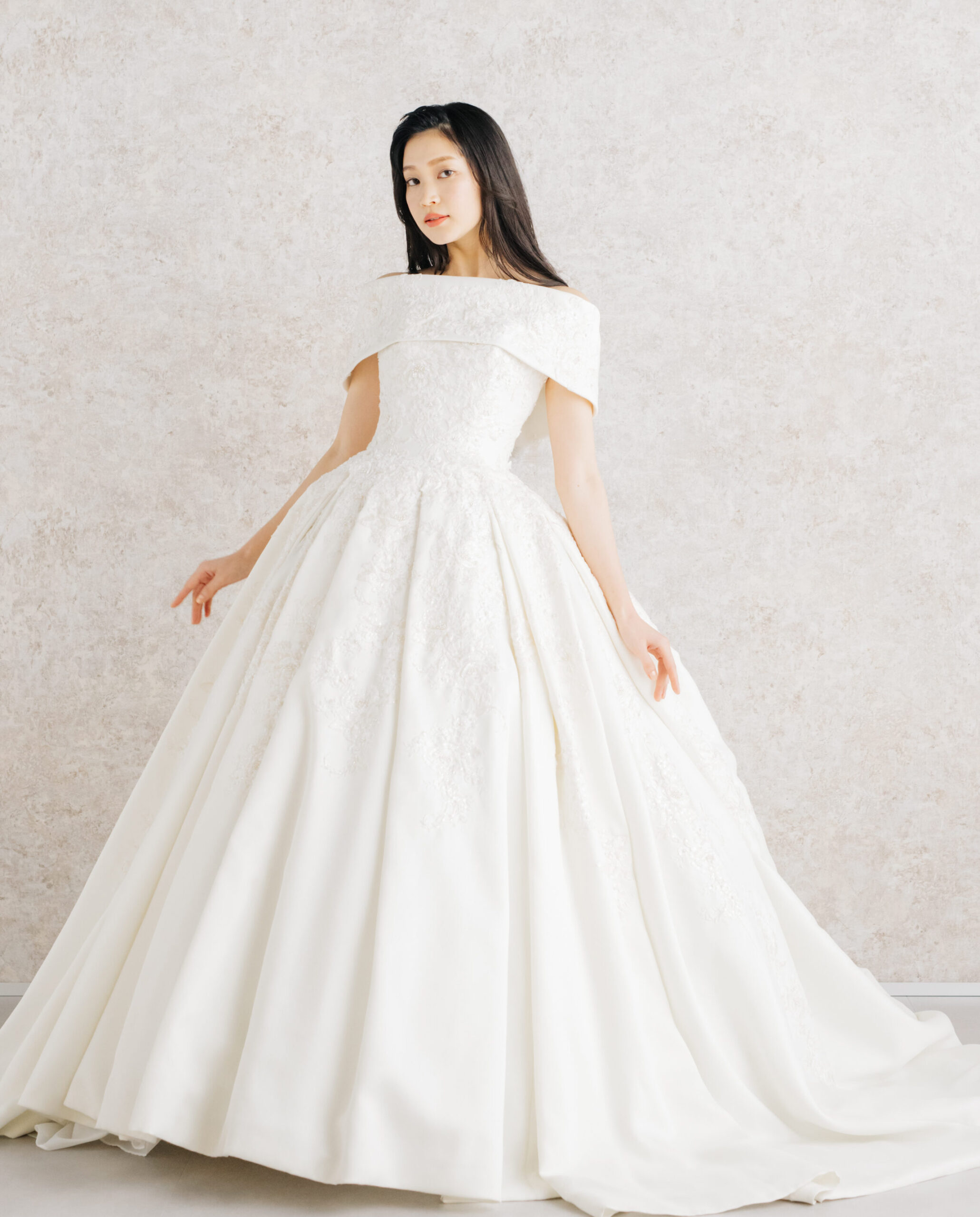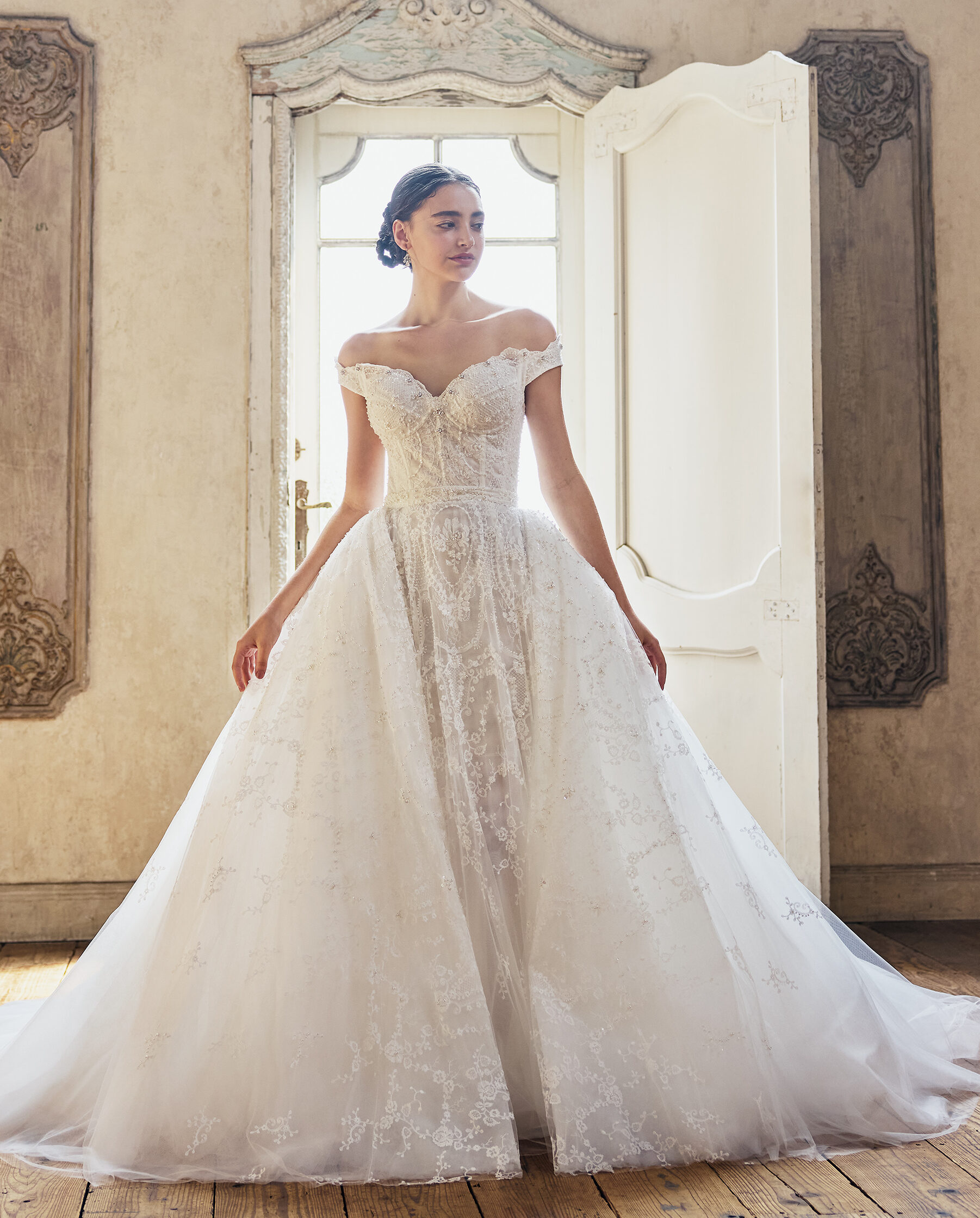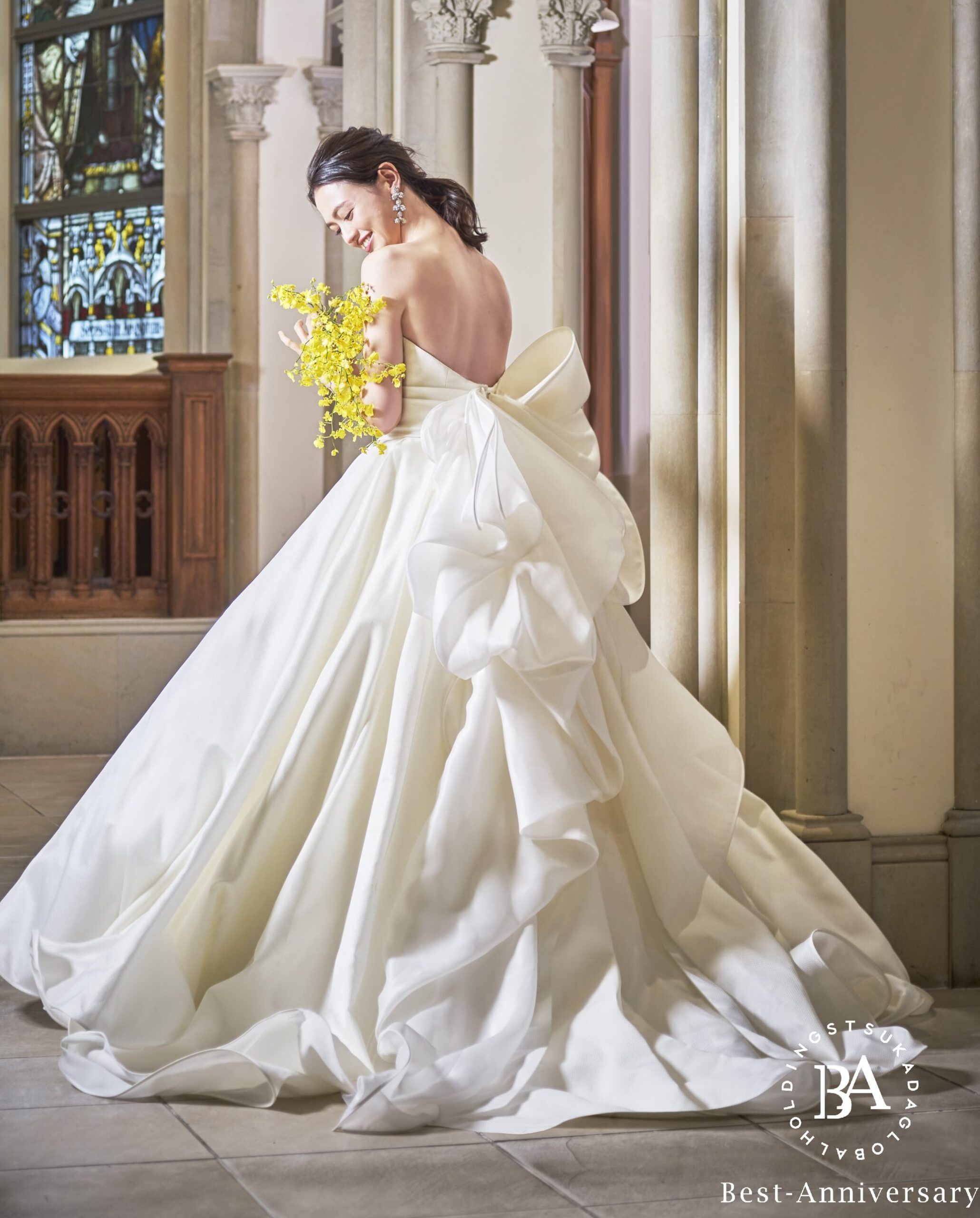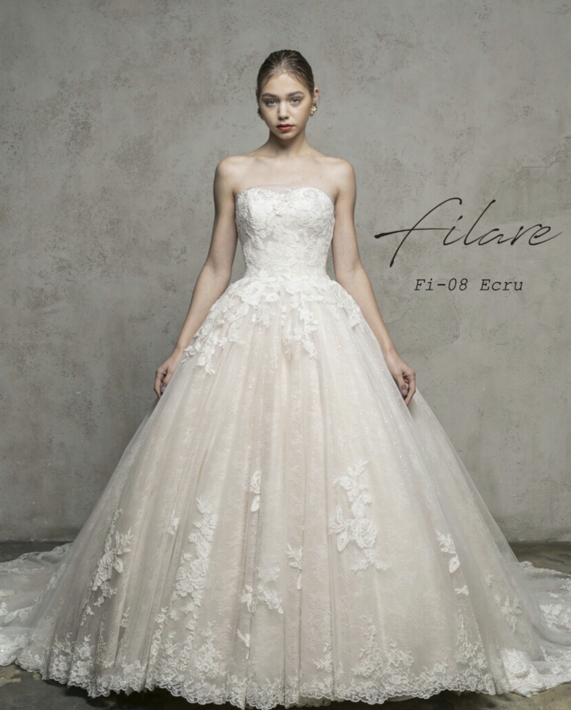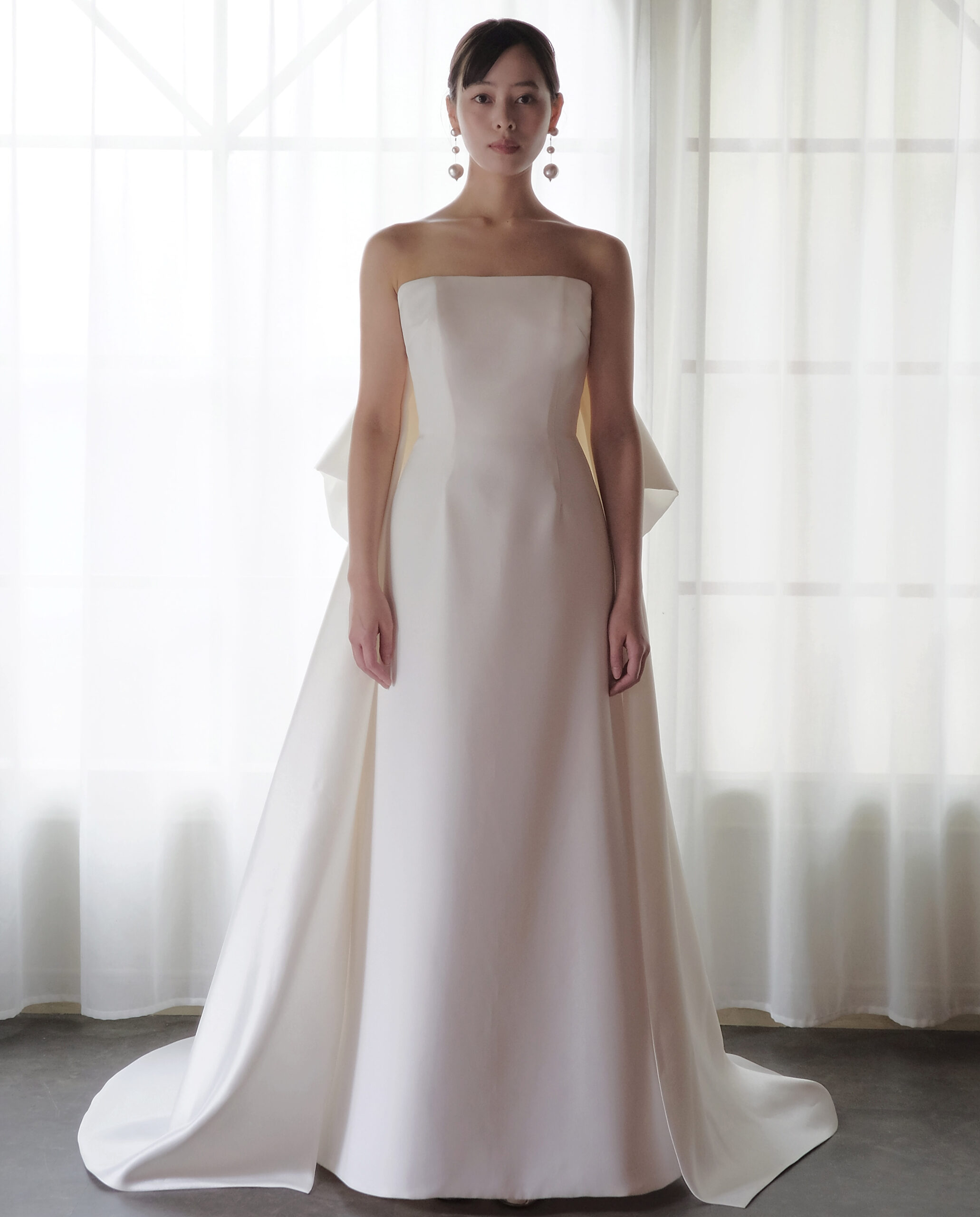 大柄の印象的なレースにビージングが施され、鎖骨がのぞくネックラインが上品な印象を与えてくれる。 ノースリーブですっきりと仕上げられ、美しい曲線を描くフィットアンドフレアのシルエット。 トランスペアレントなレースがバックスタイルを優美にしてくれる。