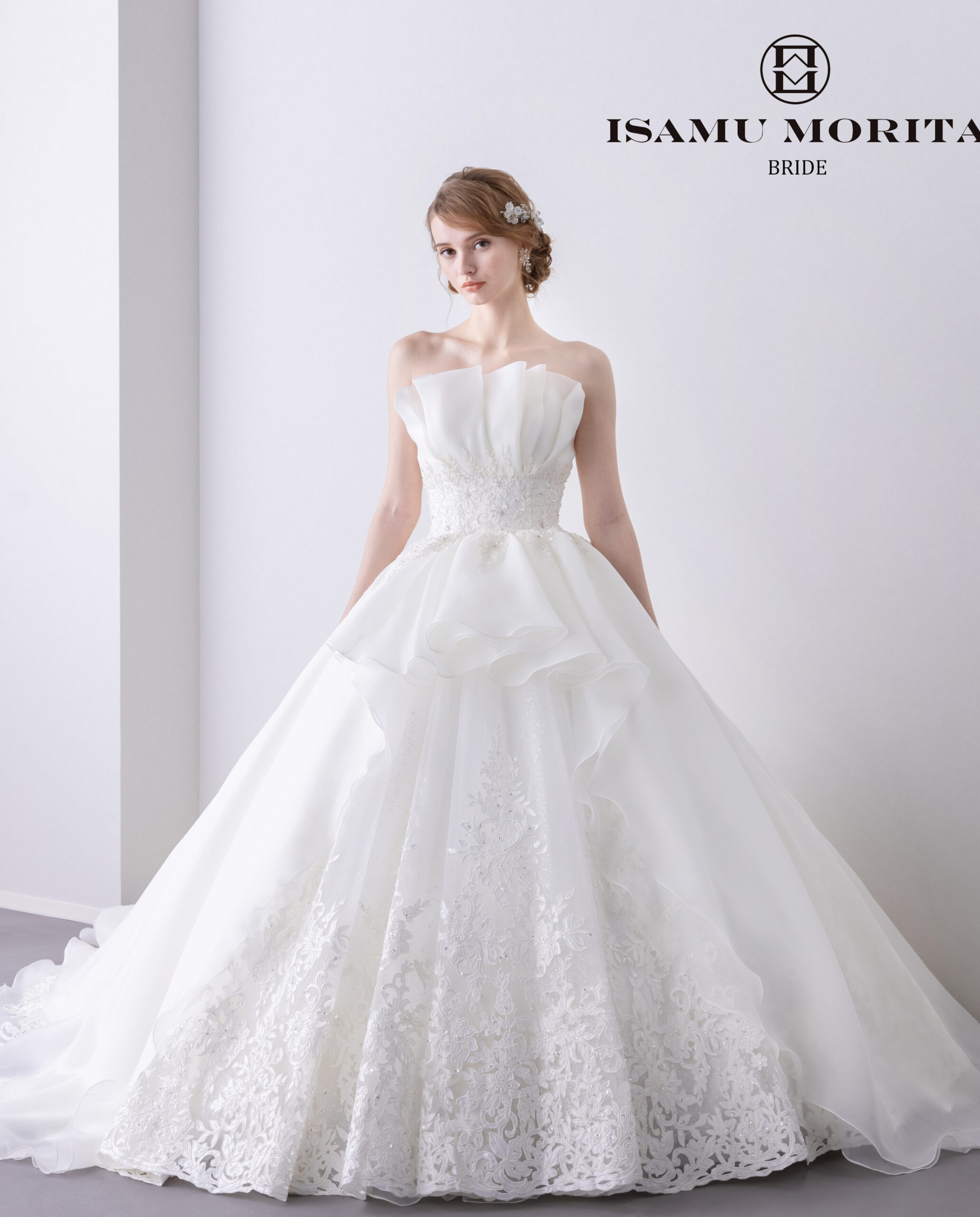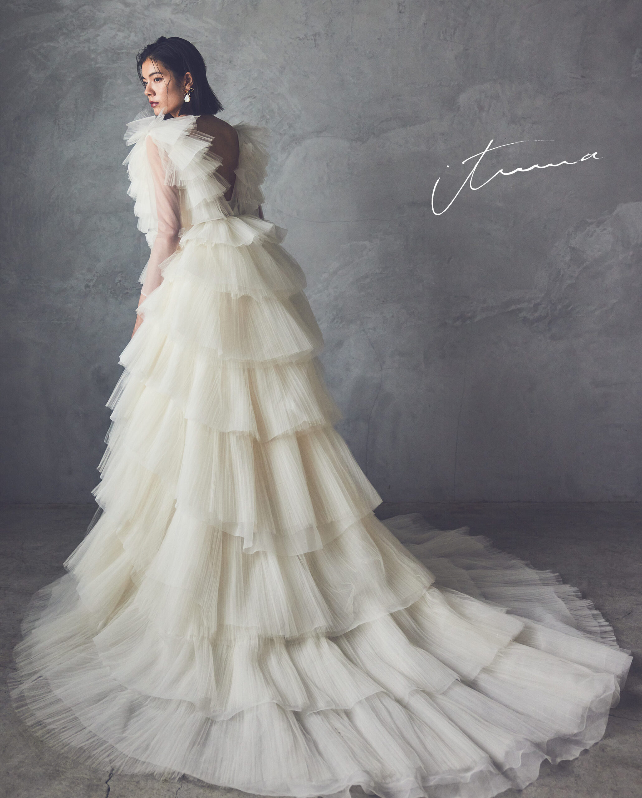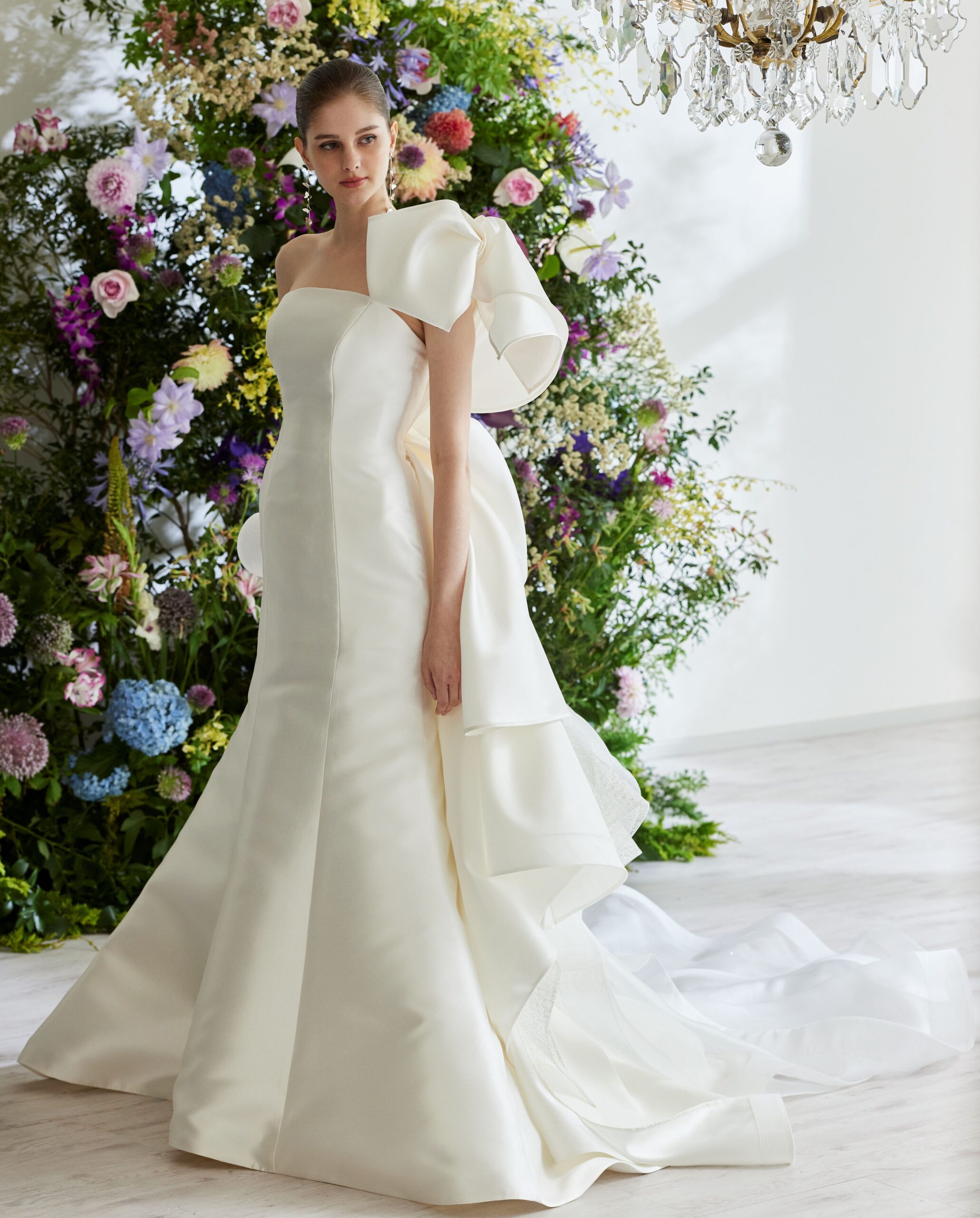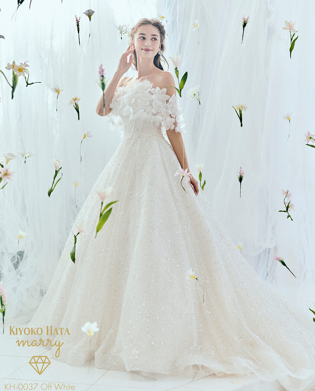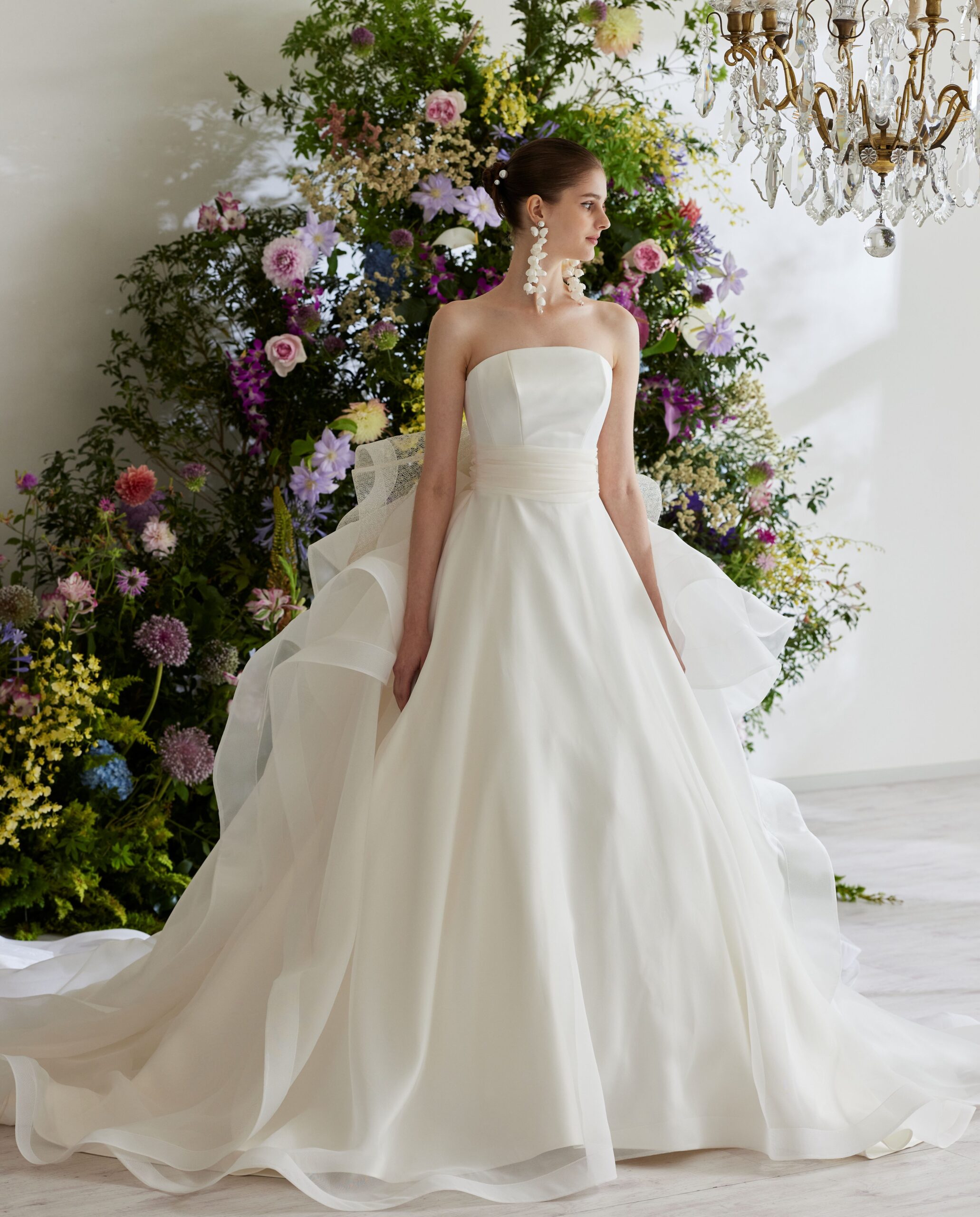 大柄の印象的なレースにビージングが施され、鎖骨がのぞくネックラインが上品な印象を与えてくれる。 ノースリーブですっきりと仕上げられ、美しい曲線を描くフィットアンドフレアのシルエット。 トランスペアレントなレースがバックスタイルを優美にしてくれる。