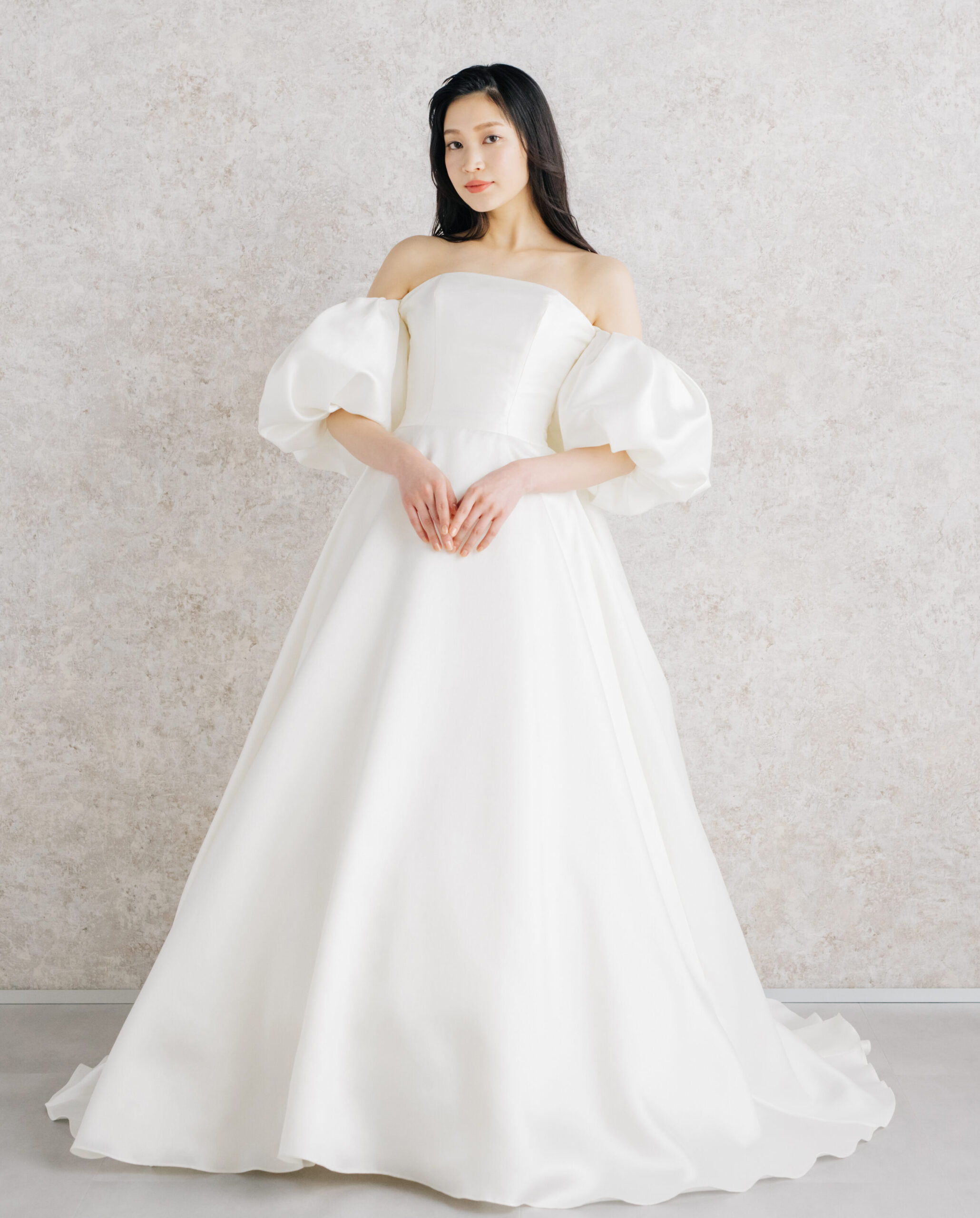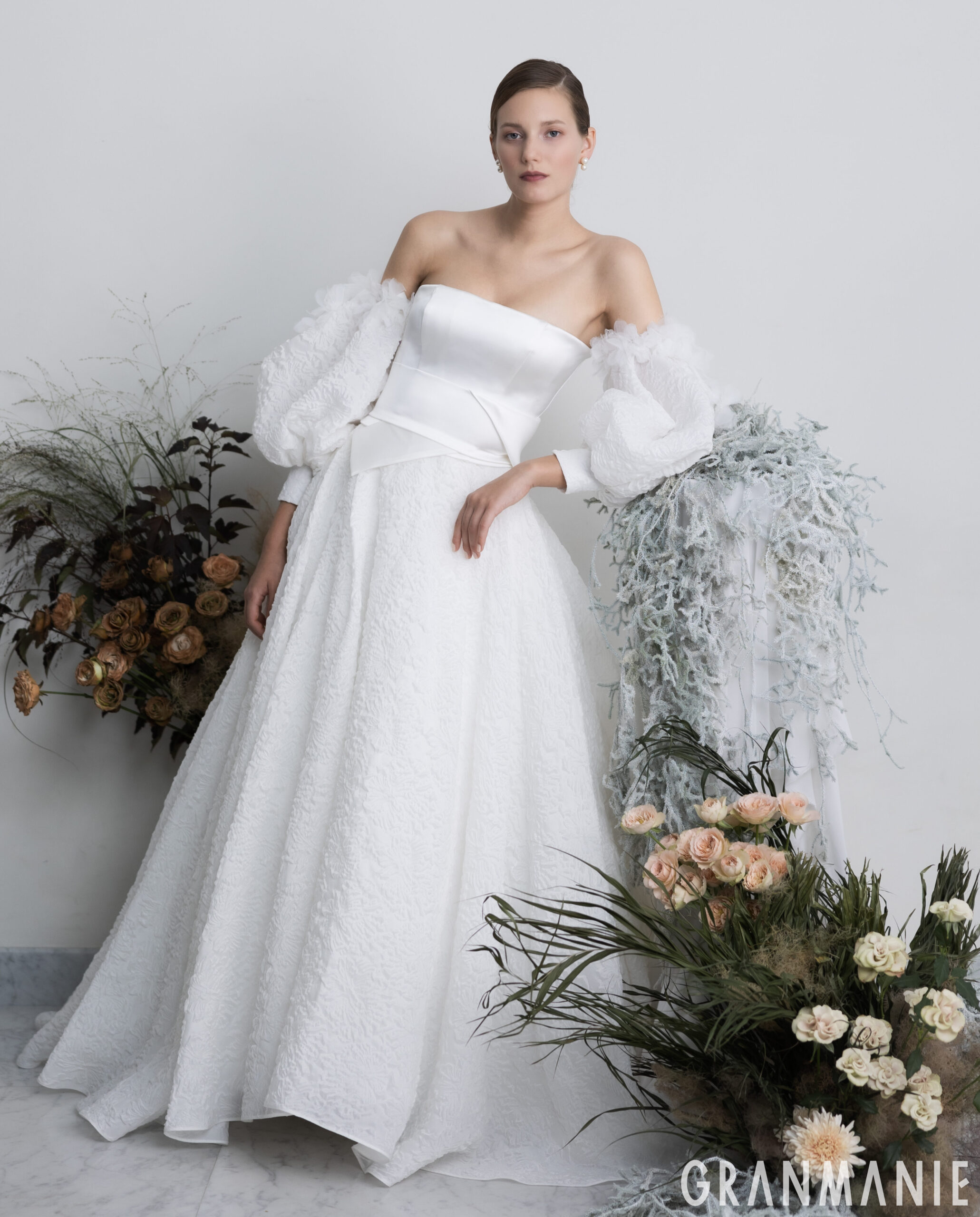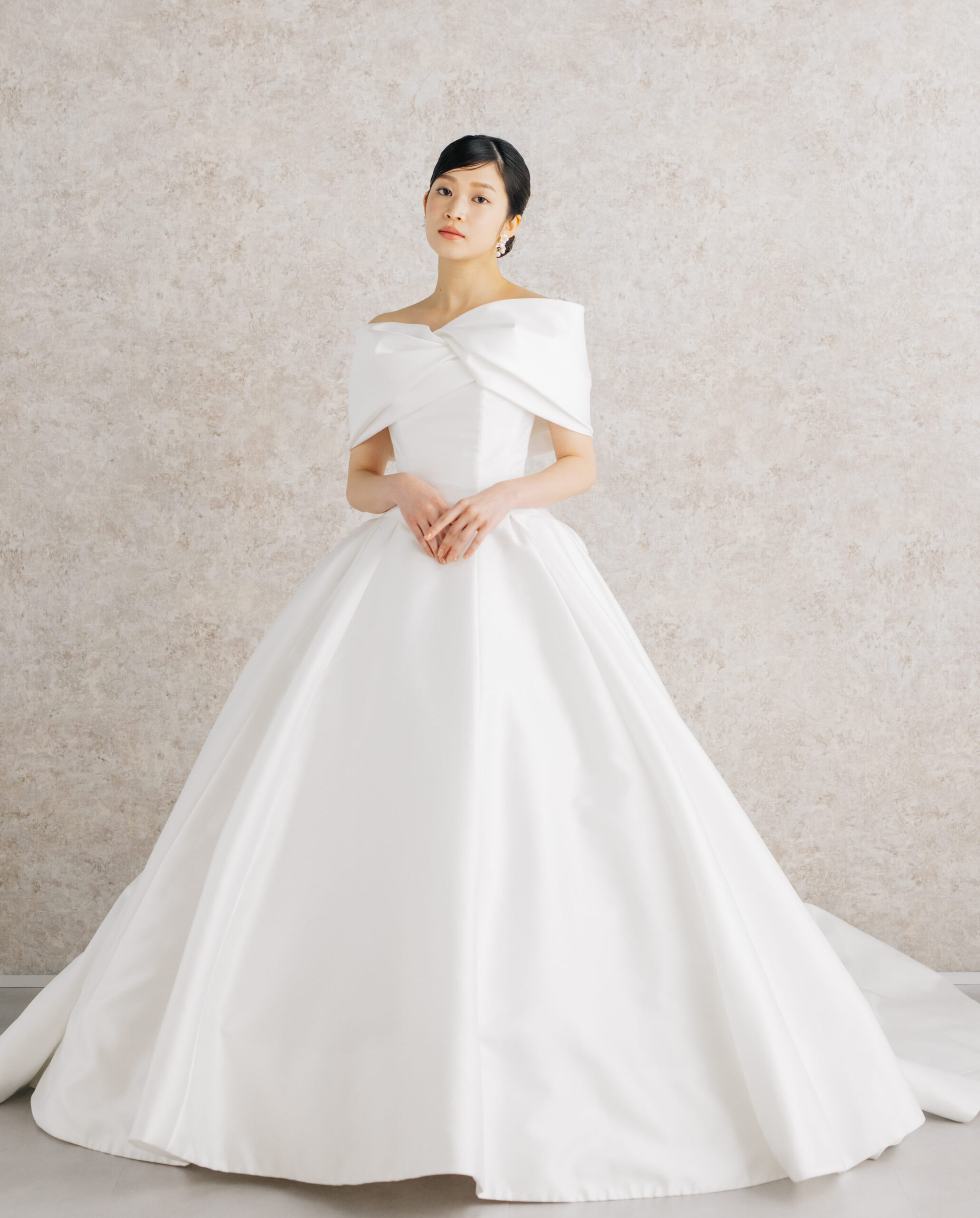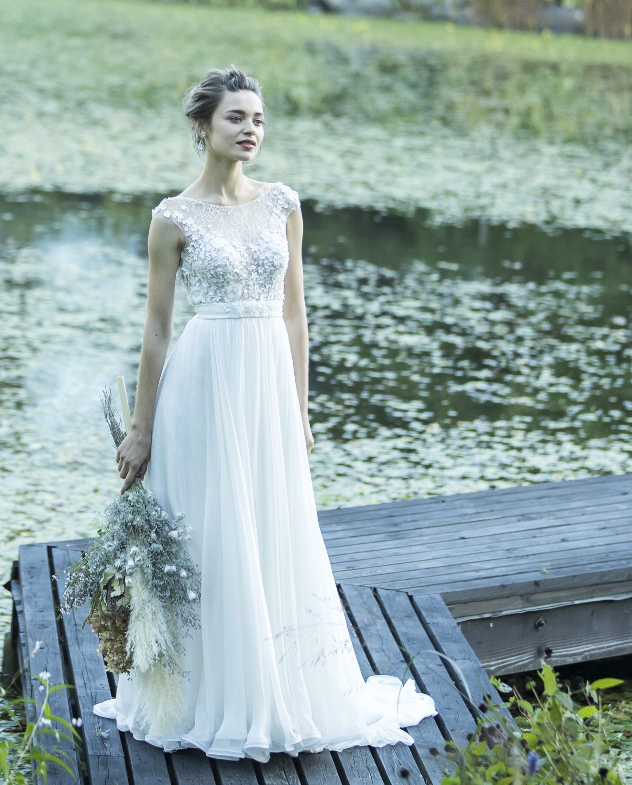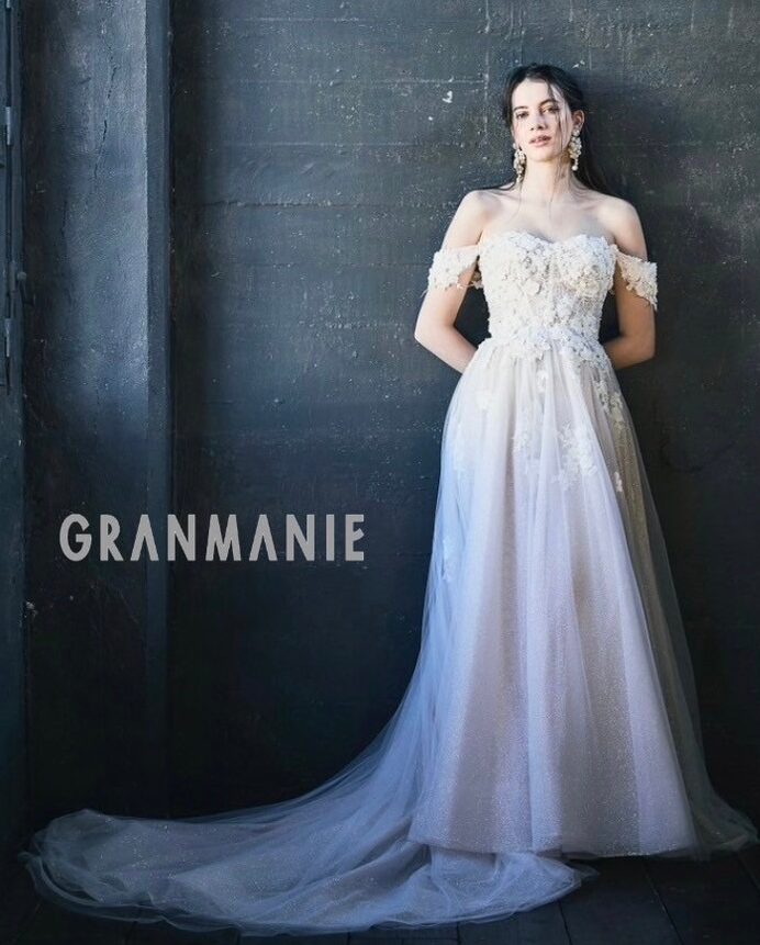 大柄の印象的なレースにビージングが施され、鎖骨がのぞくネックラインが上品な印象を与えてくれる。 ノースリーブですっきりと仕上げられ、美しい曲線を描くフィットアンドフレアのシルエット。 トランスペアレントなレースがバックスタイルを優美にしてくれる。