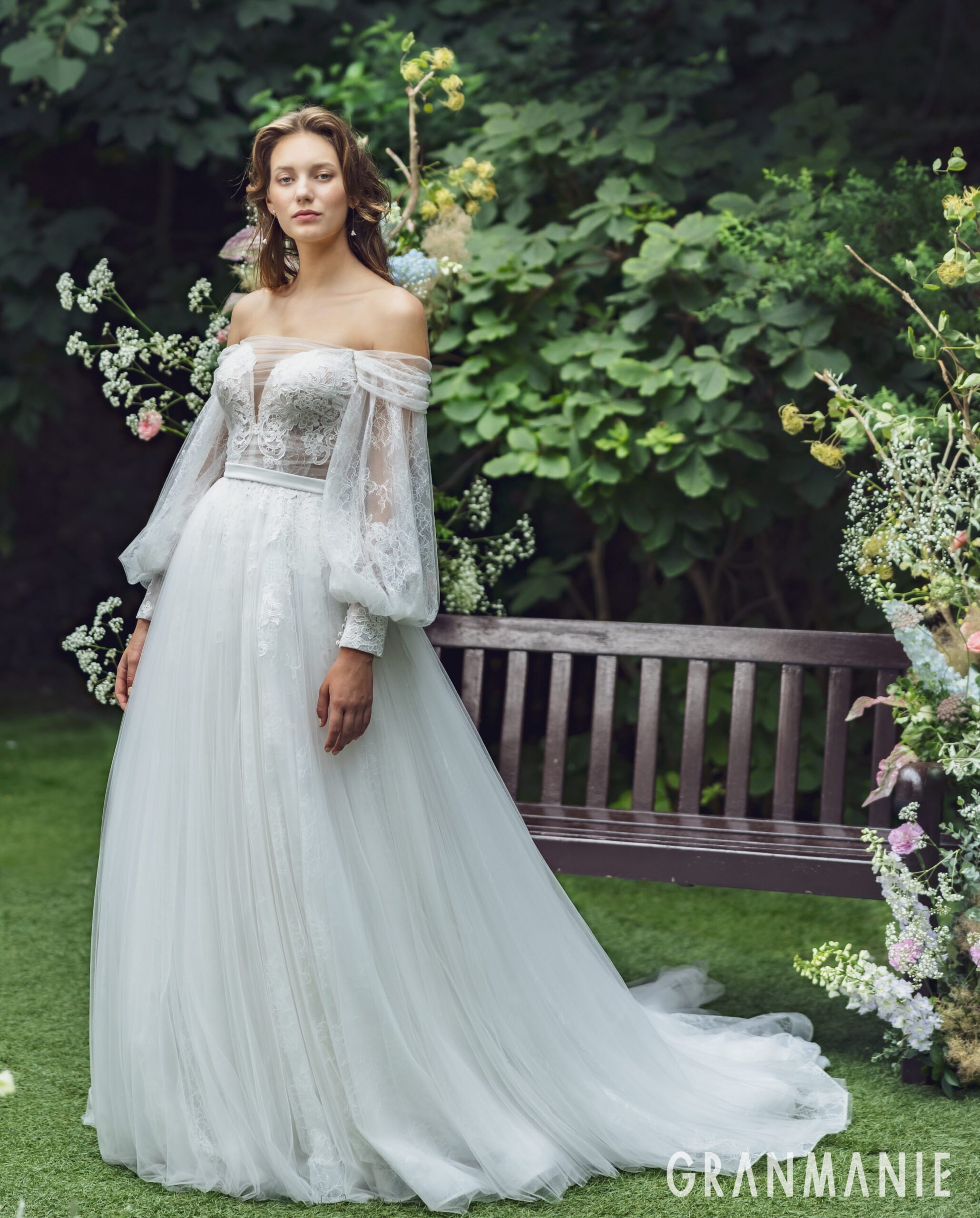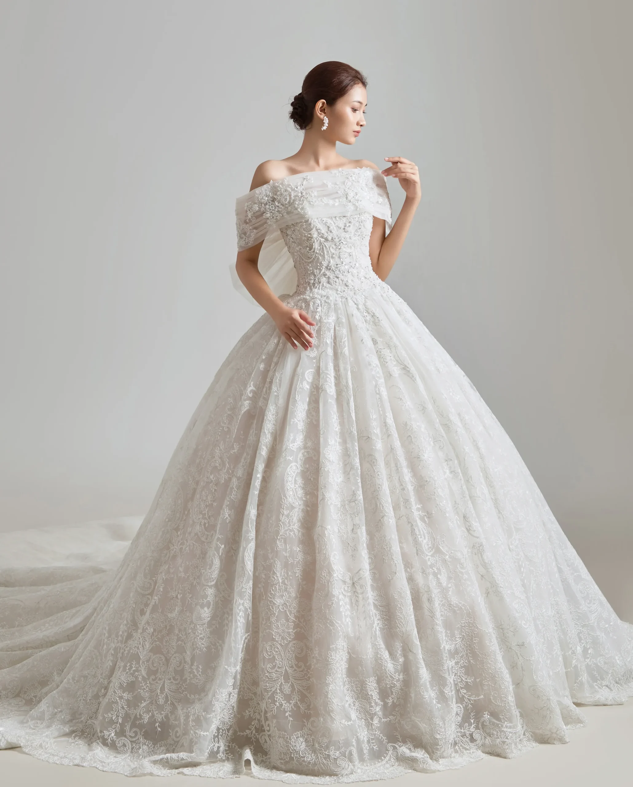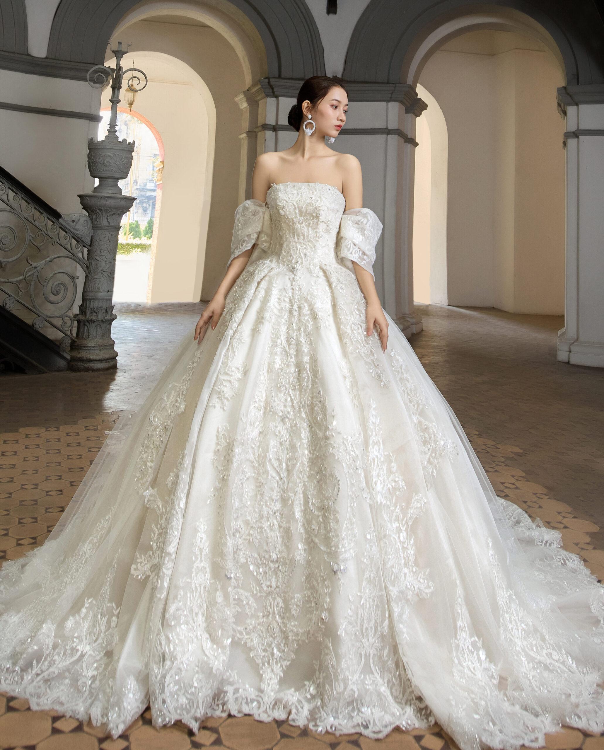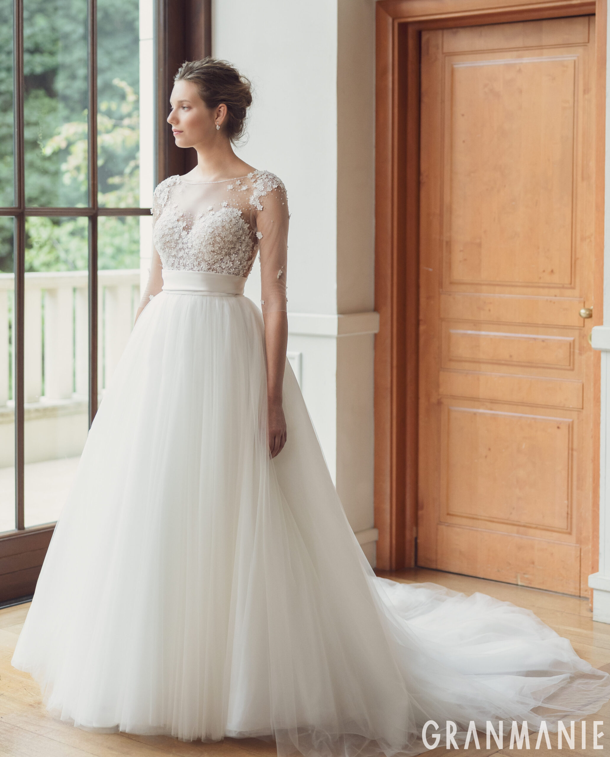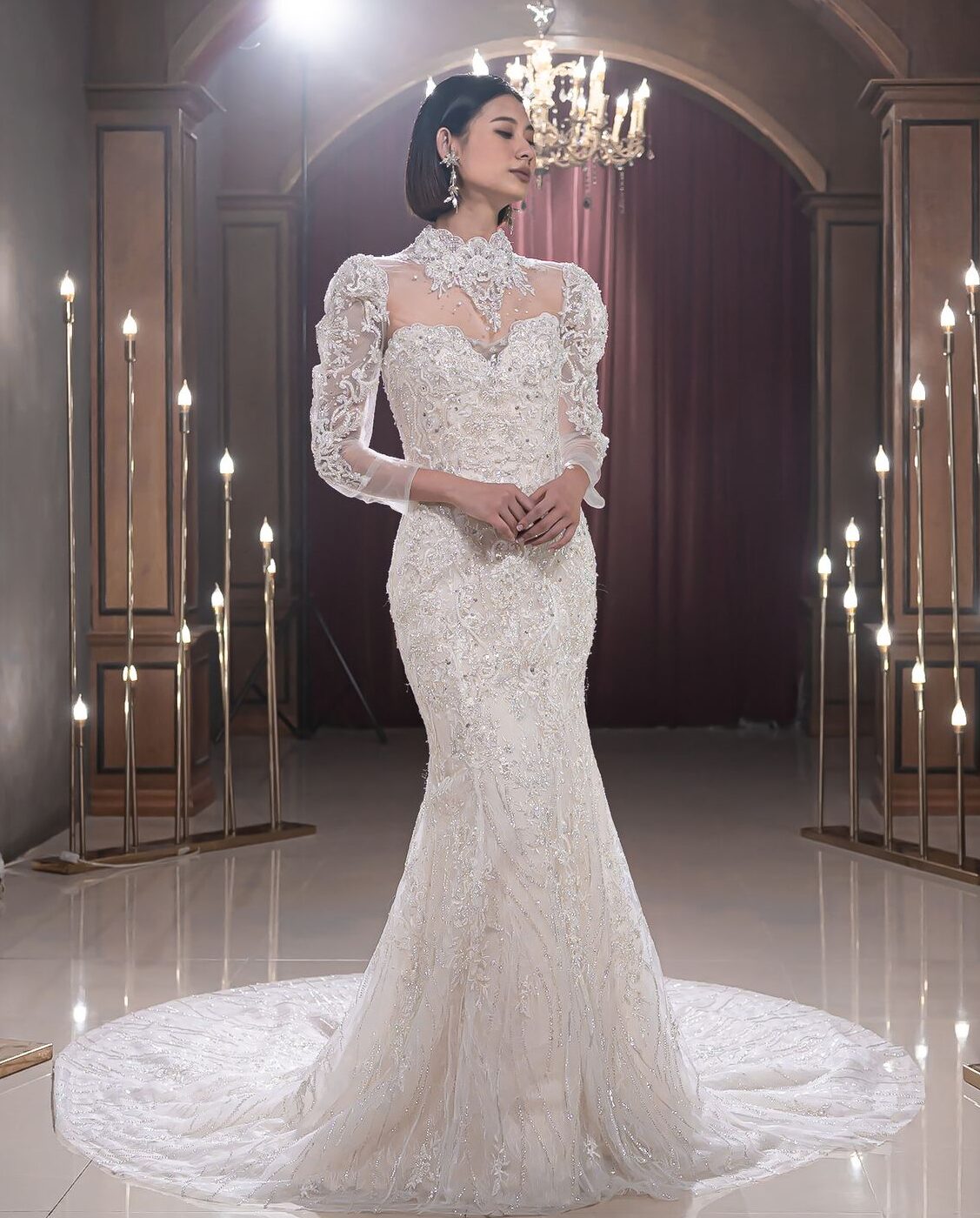 大柄の印象的なレースにビージングが施され、鎖骨がのぞくネックラインが上品な印象を与えてくれる。 ノースリーブですっきりと仕上げられ、美しい曲線を描くフィットアンドフレアのシルエット。 トランスペアレントなレースがバックスタイルを優美にしてくれる。