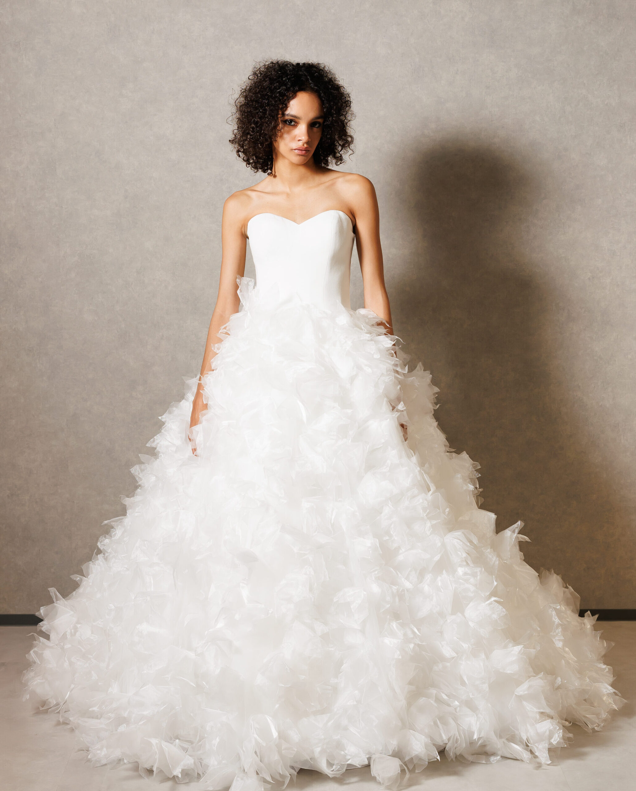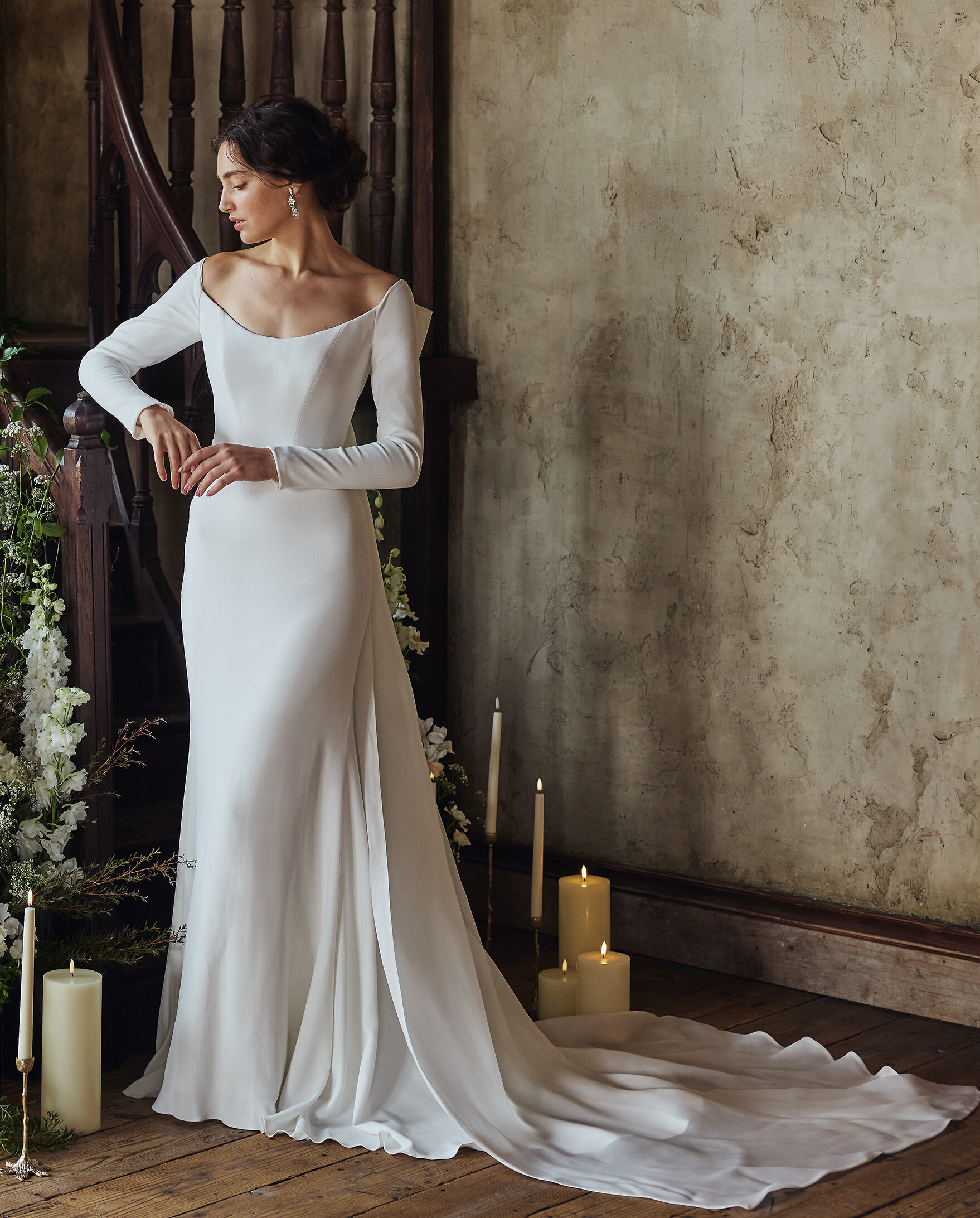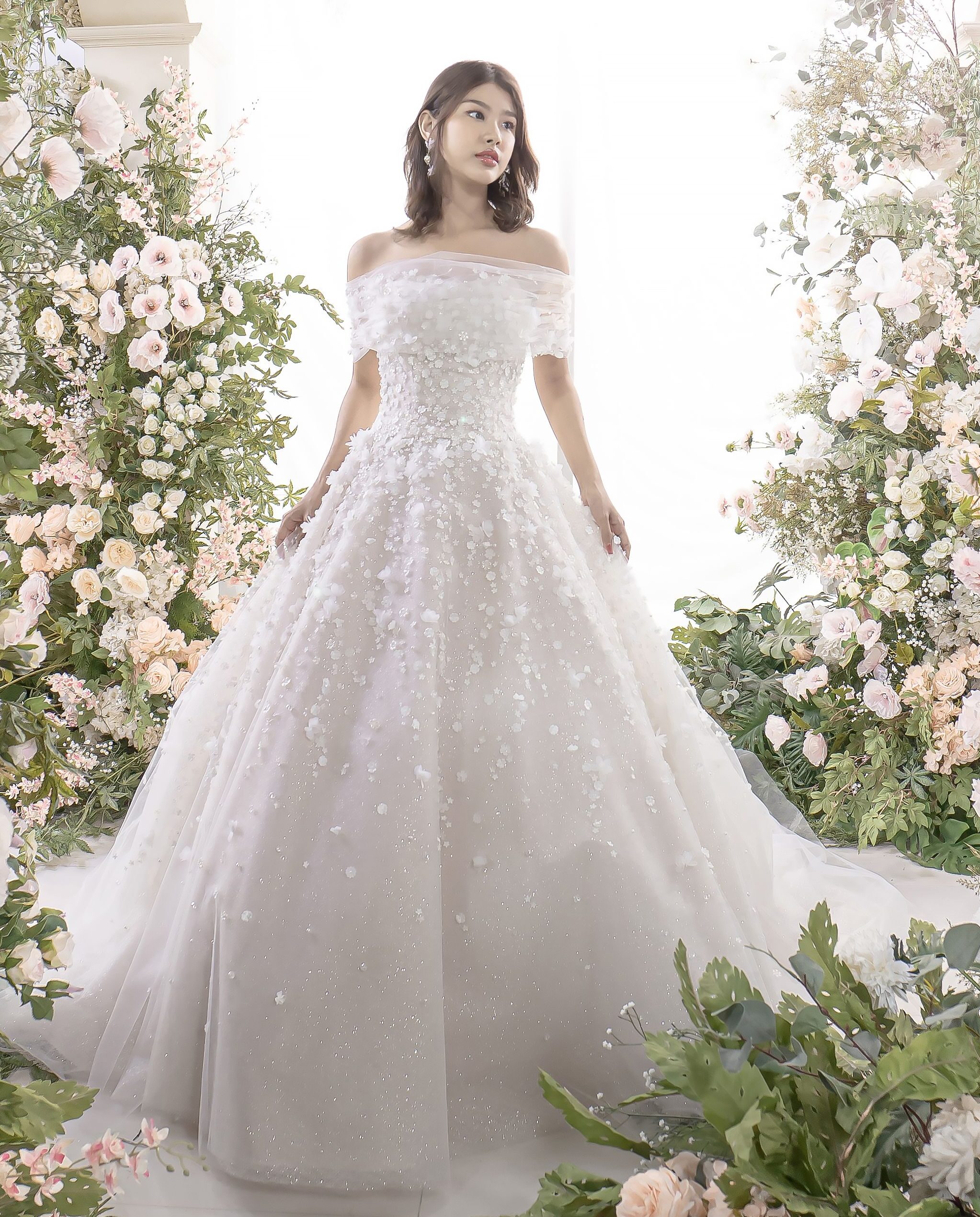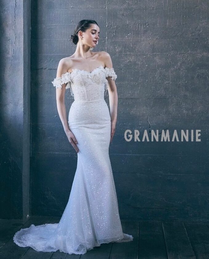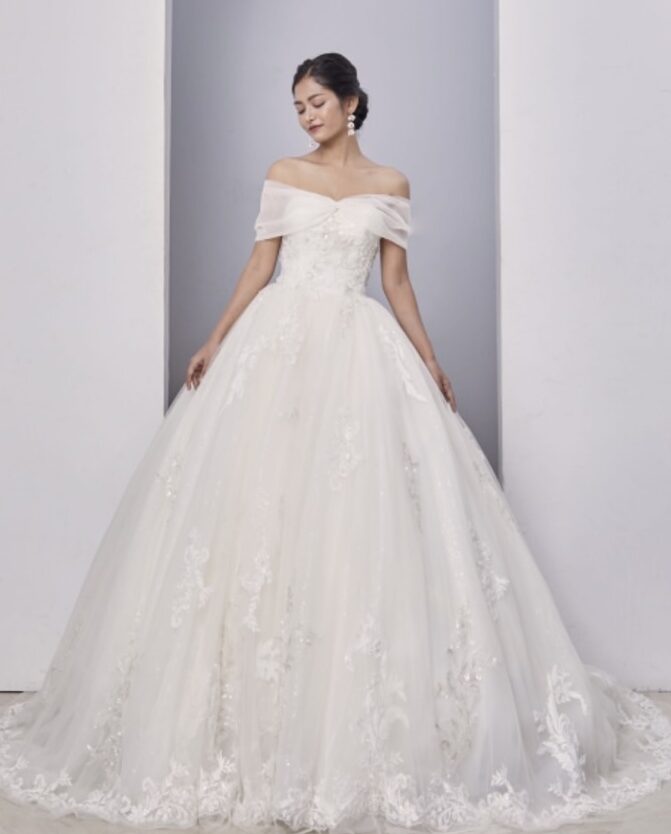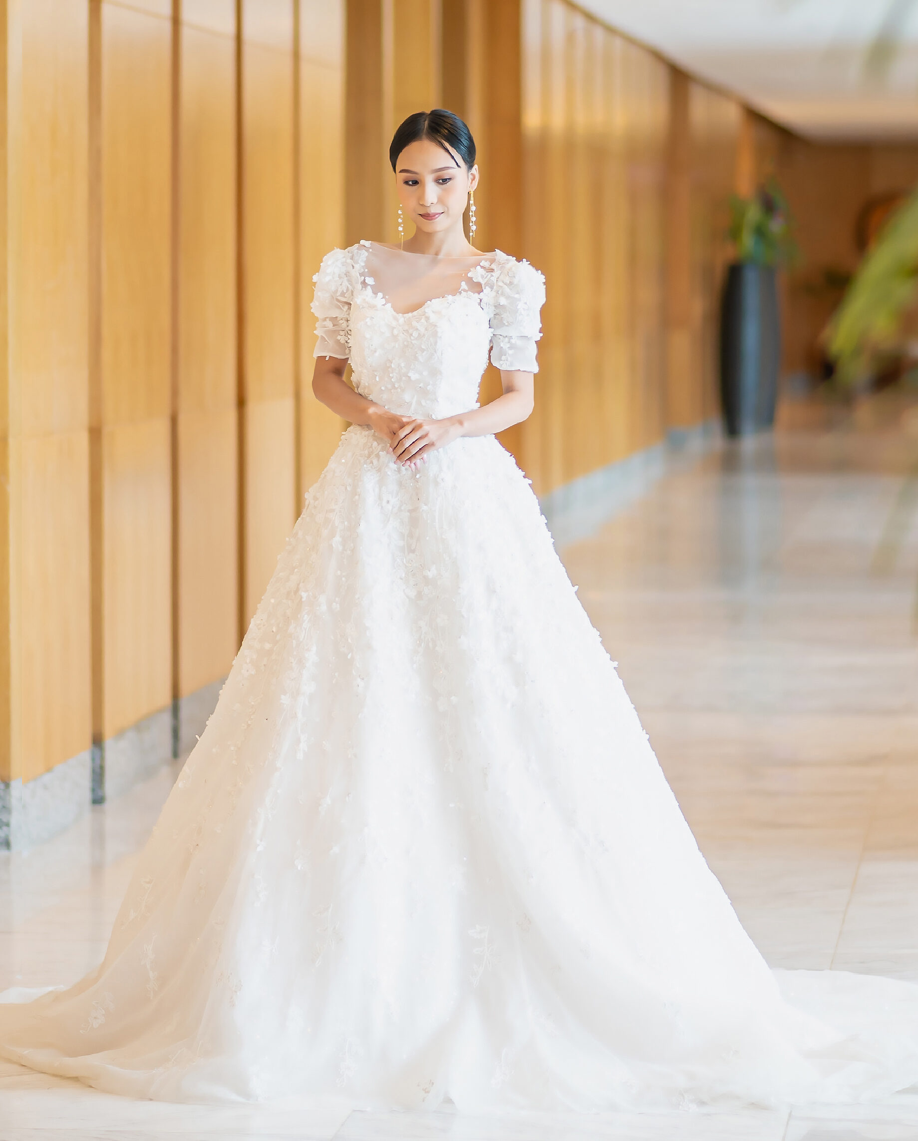大柄の印象的なレースにビージングが施され、鎖骨がのぞくネックラインが上品な印象を与えてくれる。 ノースリーブですっきりと仕上げられ、美しい曲線を描くフィットアンドフレアのシルエット。 トランスペアレントなレースがバックスタイルを優美にしてくれる。