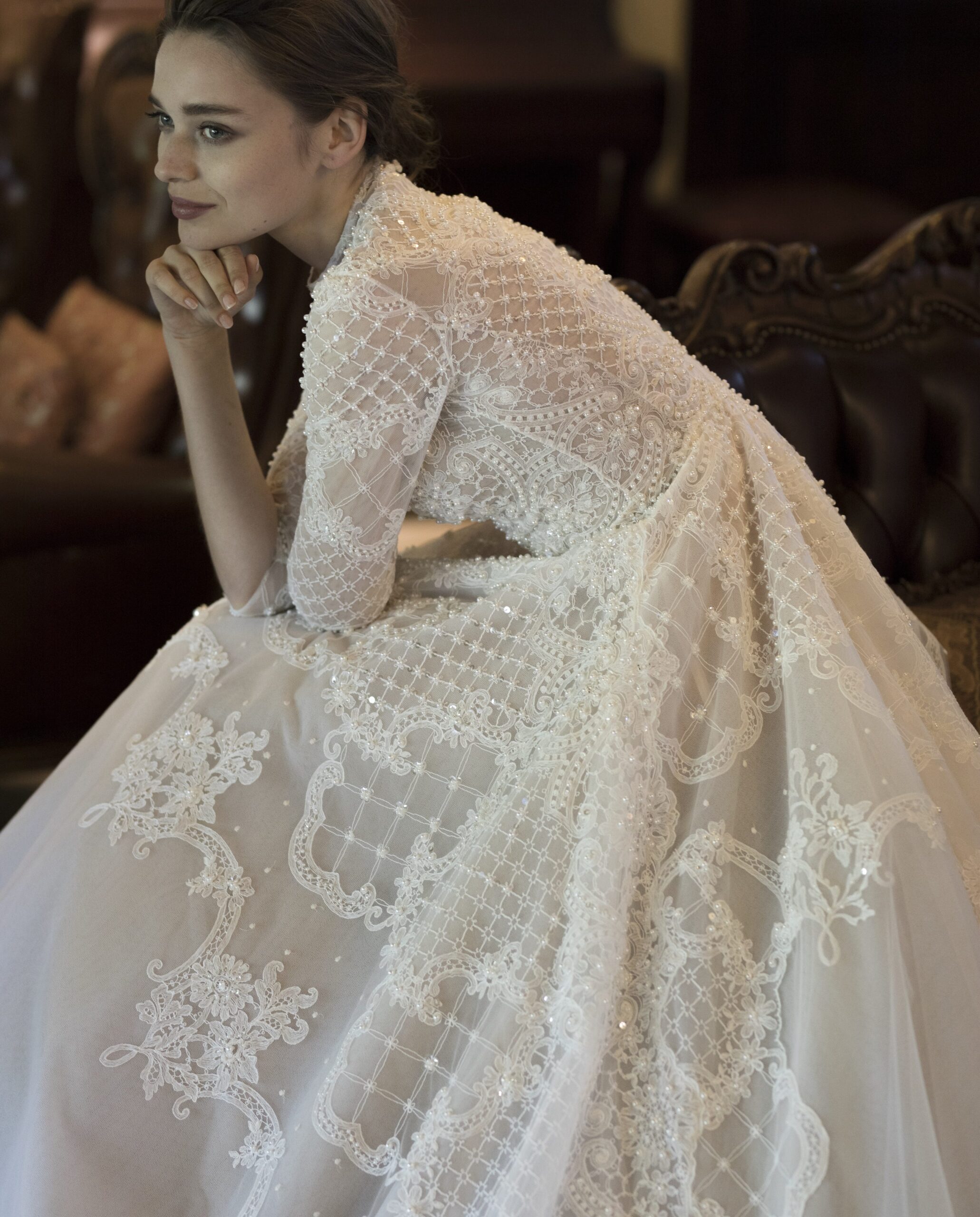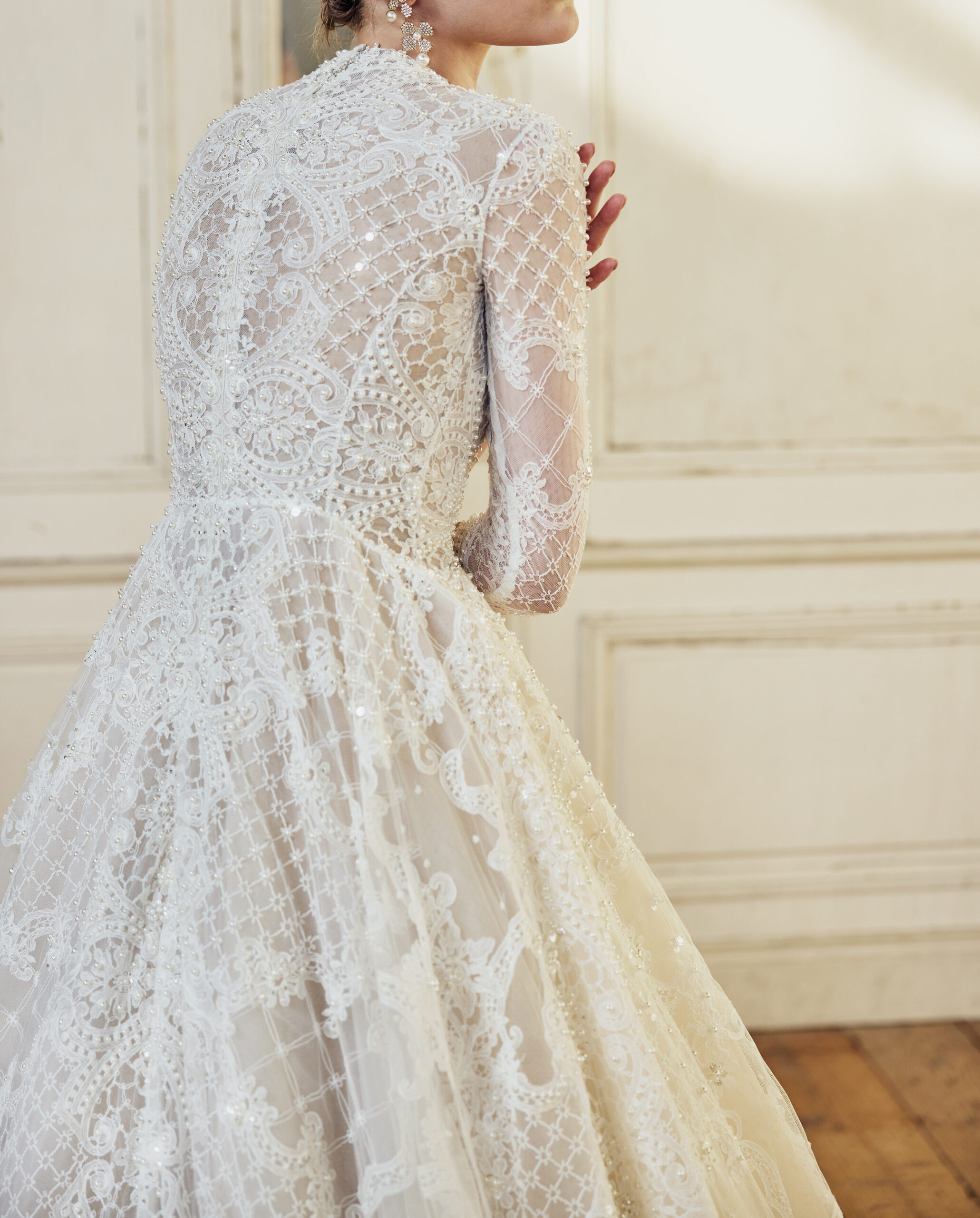 全体に施された精緻で立体的なビーディングと刺繍が圧巻の一着。丁寧に手作業でつけられたパールのビーディングはオートクチュールならではの魅力