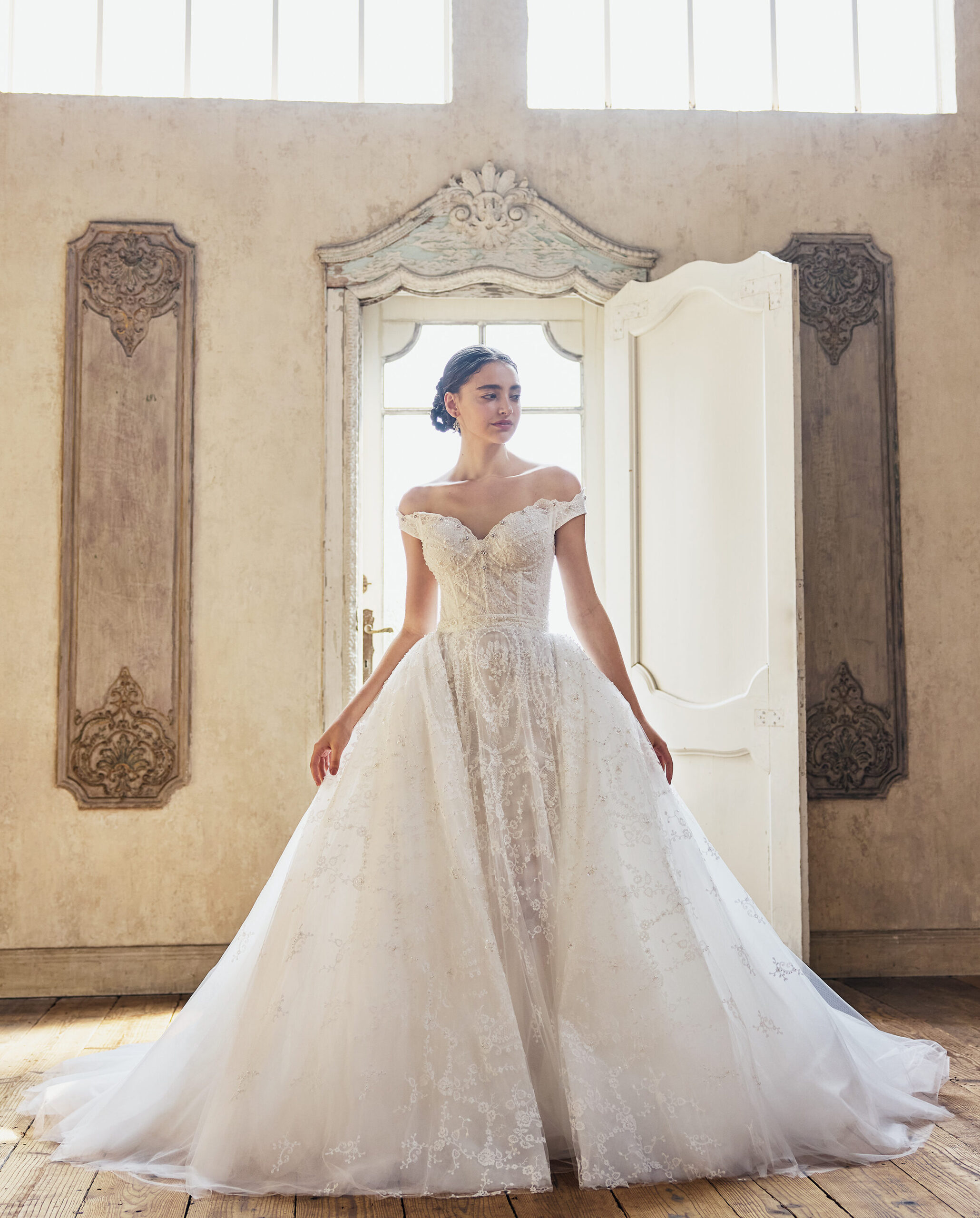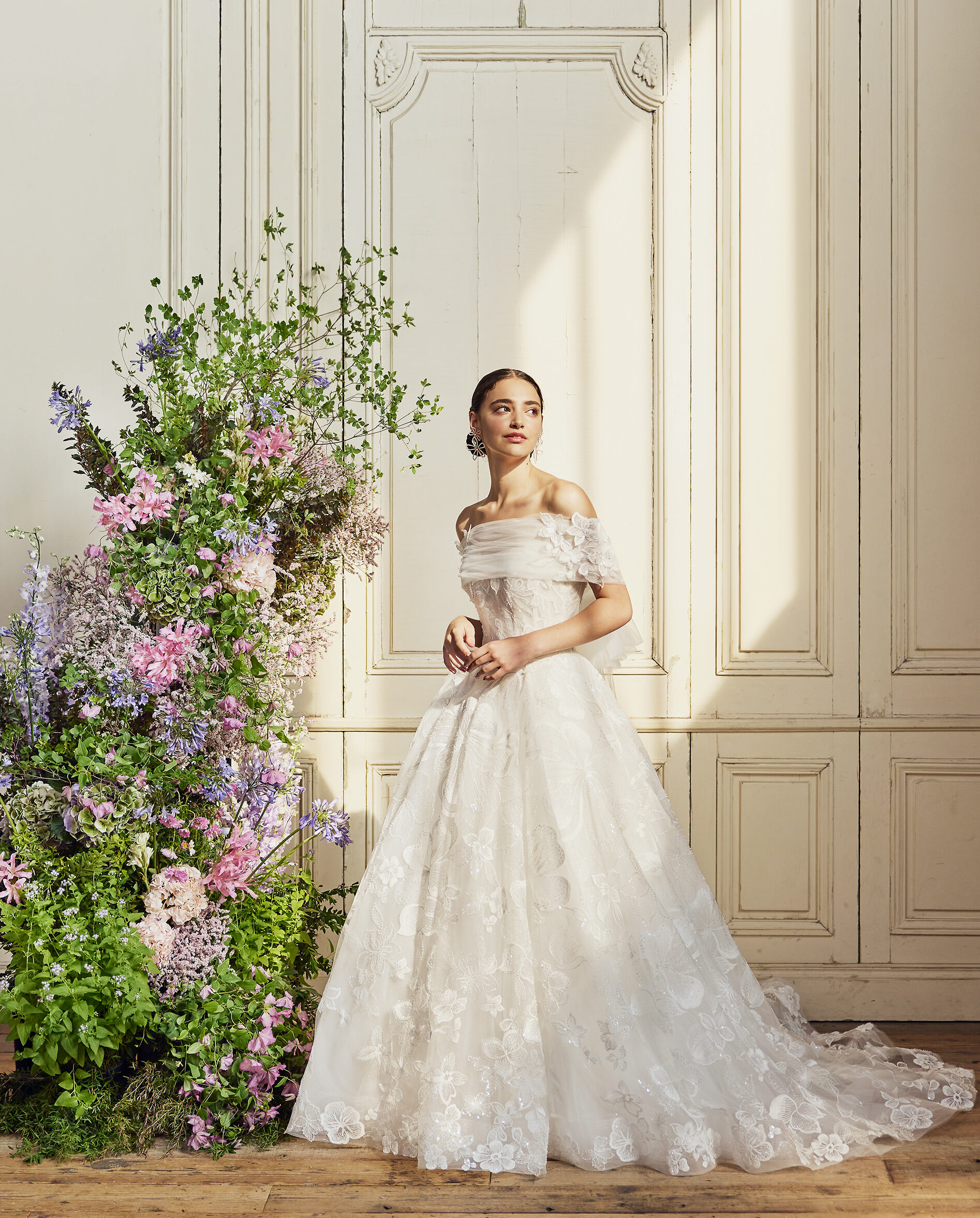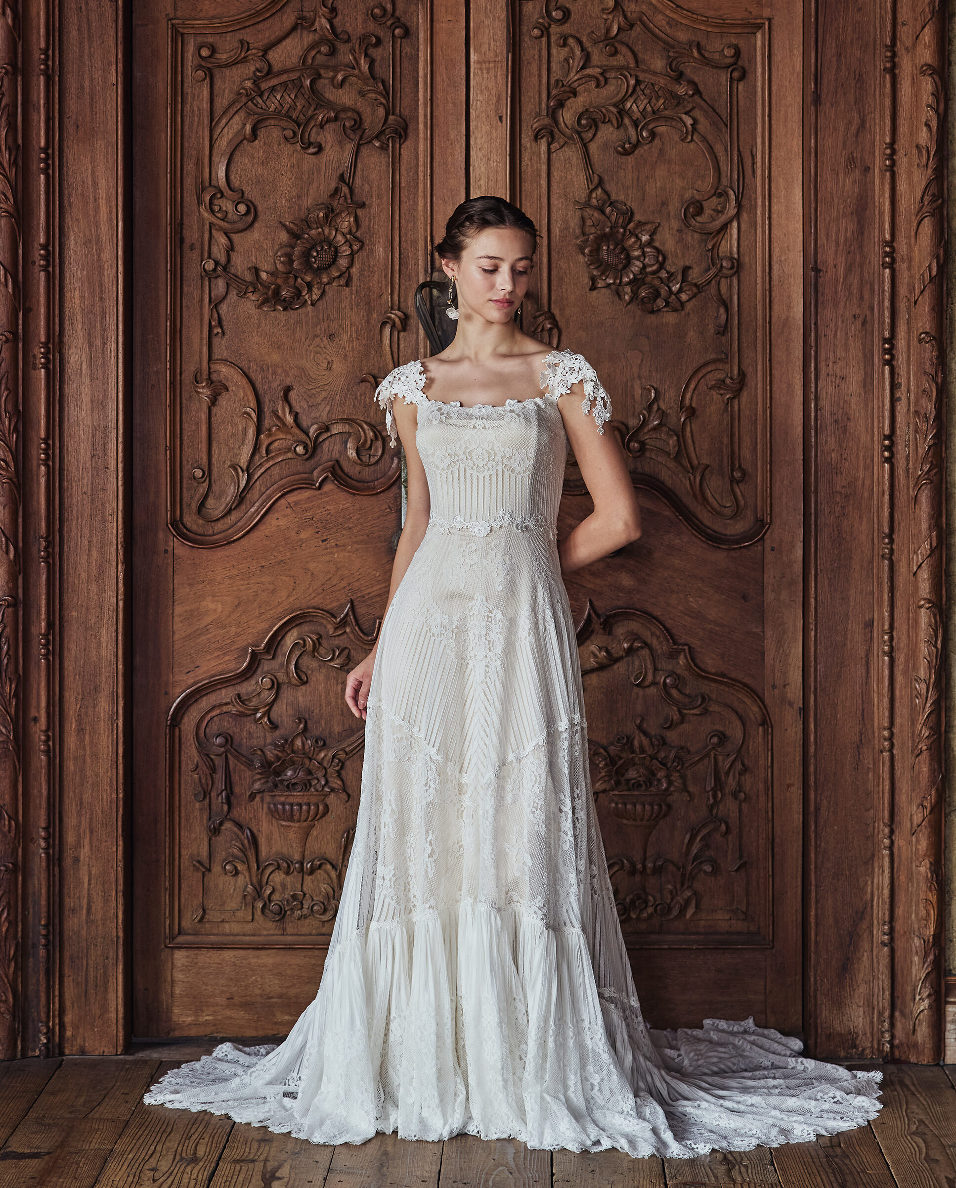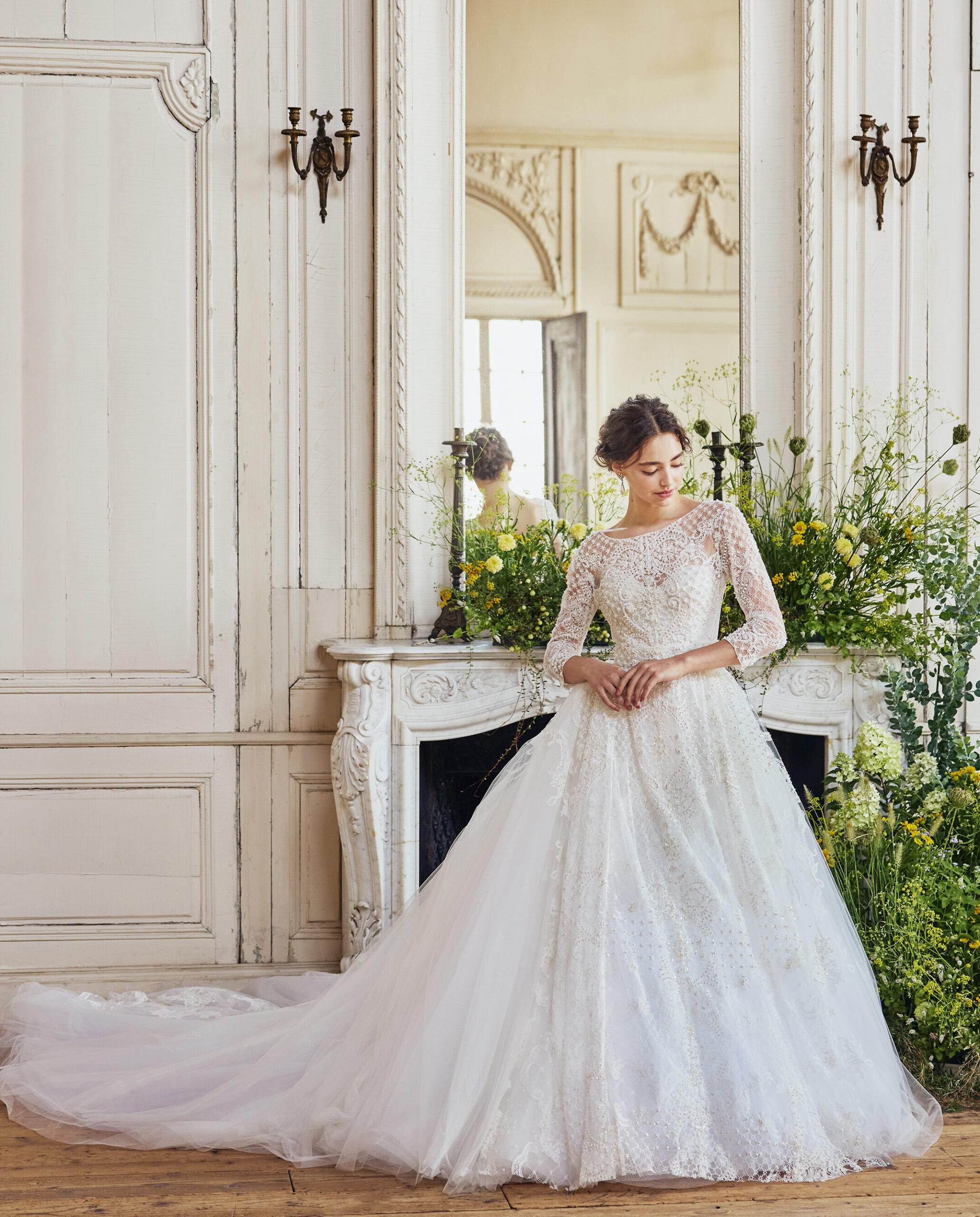 フランス製コードリバーレースをたっぷりと使用した贅沢なロングトレーンが魅力の一着。ゲストをの心に刻み込まれる存在感に。胸元から二の腕をやさしくカバーするオフショルダーが背中にVラインを描き、すっきりとエレガント。バックのリボンとフラワーモチーフで自然なメリハリをプラス。