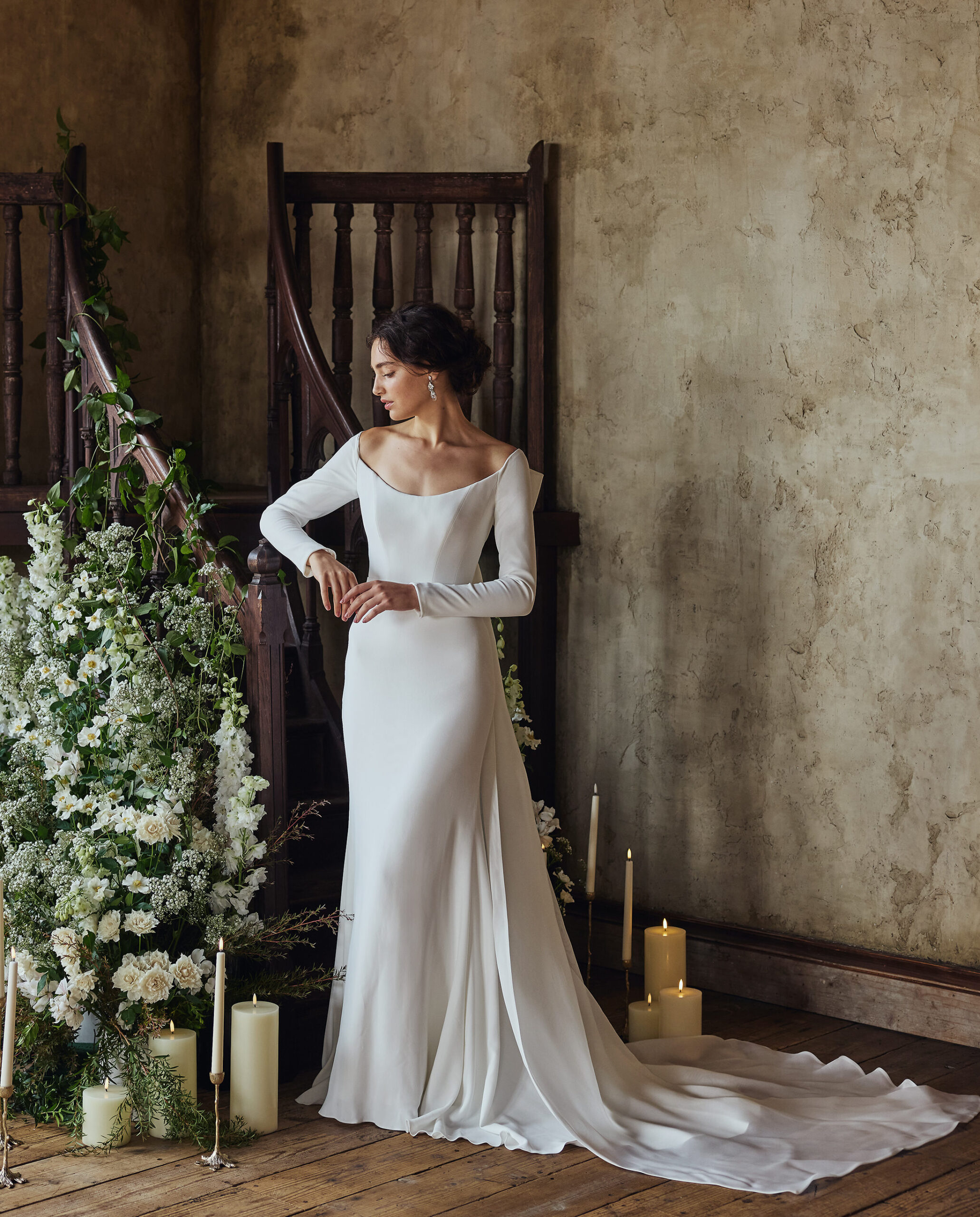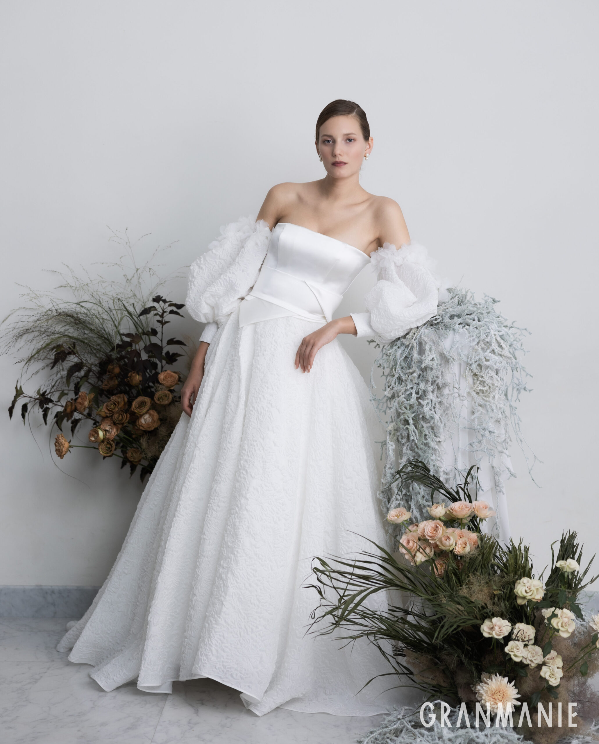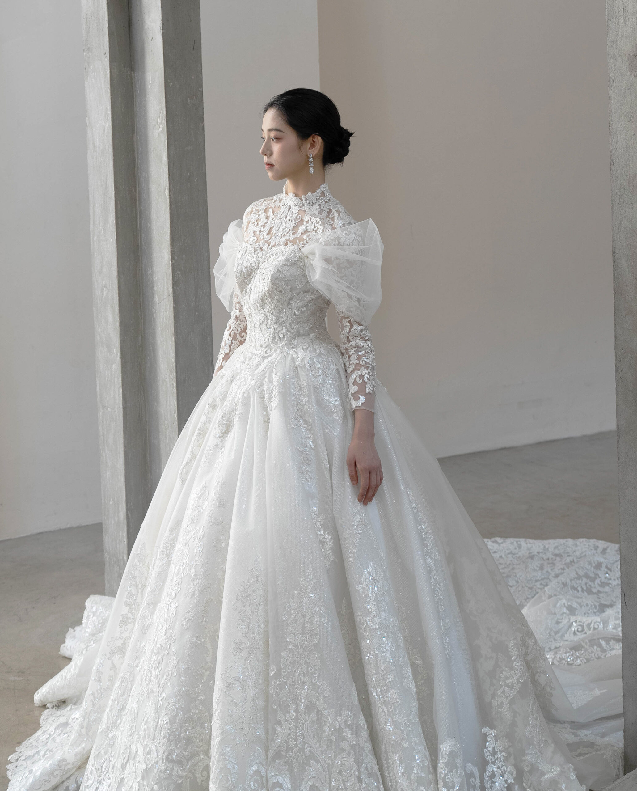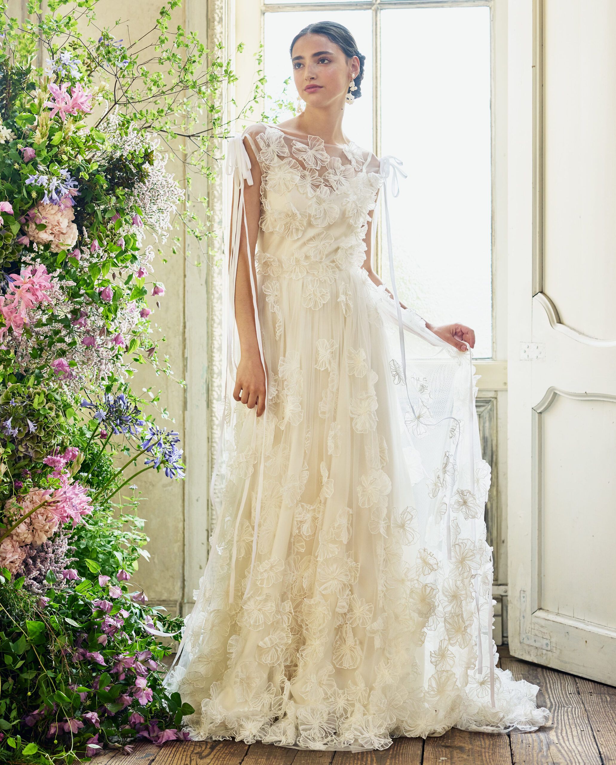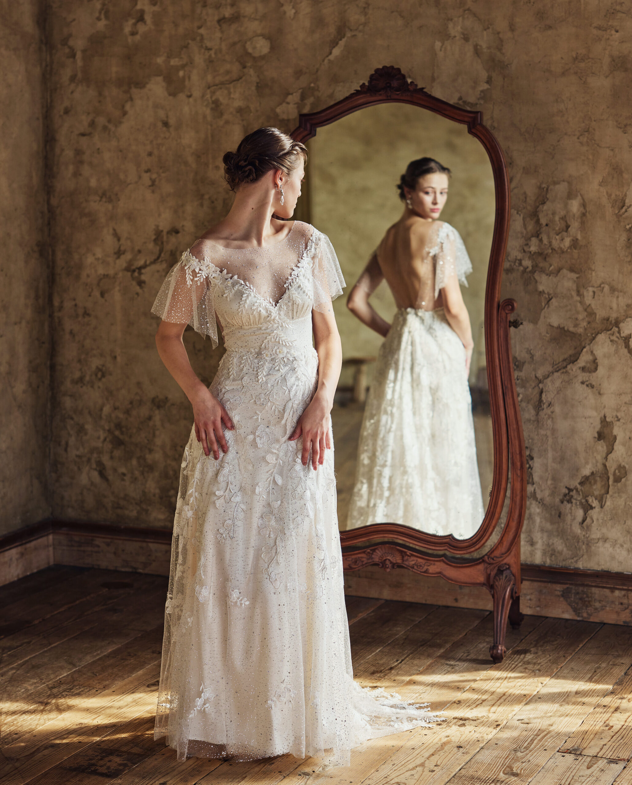 フランス製コードリバーレースをたっぷりと使用した贅沢なロングトレーンが魅力の一着。ゲストをの心に刻み込まれる存在感に。胸元から二の腕をやさしくカバーするオフショルダーが背中にVラインを描き、すっきりとエレガント。バックのリボンとフラワーモチーフで自然なメリハリをプラス。